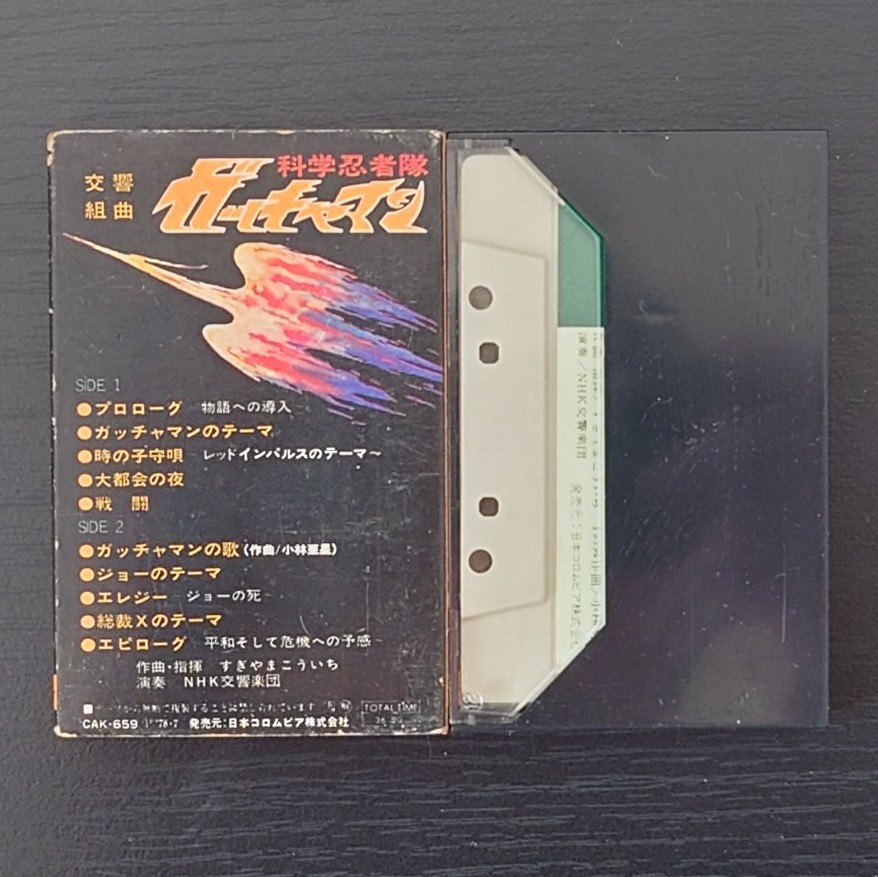 經典動畫 < 科學忍者隊 - 神勇飛鷹俠 / 交響組曲>1978 卡式錄音帶 アニメ映画 < 科学忍者隊ガッチャマン交響組曲>1978 カセットテープ 日本製/Made In Japan 卡式錄音帶狀況良好附歌紙, . 封套及內頁由於年代久遠難免出現少許歲月痕跡, 決定購買前請小心考慮, 不設退換. 一般可在石硤尾站交收, 另可按買家需要安排順豐到付送貨. 曲目/SONG LIST 交響組曲 A1 プロローグ (物語への導入) 2:37 A2 ガッチャマンのテーマ 3:38 A3 時の子守唄 (レッドインパルスのテーマ) 6:11 A4 大都会の夜 0:55 A5 戦闘 5:00 B1 ガッチャマンの歌 1:06 B2 ジョーのテーマ 3:24 B3 エレジー (ジョーの死) 4:47 B4 総裁Xのテーマ 5:55 B5 エピローグ (平和そして危機への予感) 2:47