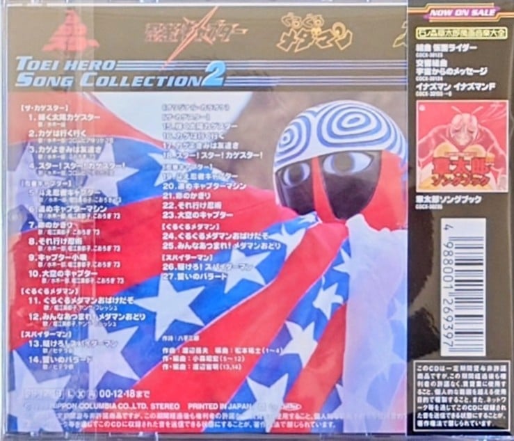 日本特撮 < 東映英雄歌曲全集2 > 1998 CD專輯 テレビ映画 < 東映ヒーローソングコレクション2 > 1998 CDアルバム 主打特撮主題歌/片尾歌及卡拉OK音樂包括: 影星奇俠, 忍者七俠, 大眼睛, 東映蜘蛛俠等27首. 日本生產 / Made in Japan CD 唱片狀況近全新沒有花痕附側紙, CD專輯集合多套70年代經典日本特撮主題歌/片尾曲等, 屬特撮迷罕有珍藏品. 由於年代久遠封套及內頁部份難免出現少許歲月痕跡, 決定購買前請小心考慮, 不設退換. 一般交收在石硤尾鐵路站, 可按買家需要另行安排順豐送貨. 曲目/SONG LIST ザ・カゲスター 1 輝く太陽影スター 2 カゲは行く行く 3 カゲよきみは友達さ 4 スター! スター! カゲスター 忍者キャプター 5 斗え忍者キャプター 6 進めキャプターマシン 7 命のかぎり 8 それ行け忍術 9 キャプター小唄 10 大空のキャプター ぐるぐるメダマン 11 ぐるぐるメダマンおばけだぞ 12 みんなあつまれ! メダマンおどり スパイダーマン 13 駆けろ! スパイダーマン 14 誓いのバラード オリジナル・カラオケ ザ・カゲスター 15 輝く太陽カゲスター 16 カゲは行く行く 17 カゲよきみは友達さ 18 スター! スター! カゲスター! 忍者キャプター 19 斗え忍者キャプター 20 進めキャプターマシン 21 命のかぎり 22 それ行け忍術 23 大空のキャプター ぐるぐるメダマン 24 ぐるぐるメダマンおばけだぞ 25 みんなあつまれ! メダマンおどり スパイダーマン 26 駆けろ! スパイダーマン 27 誓いのバラード
