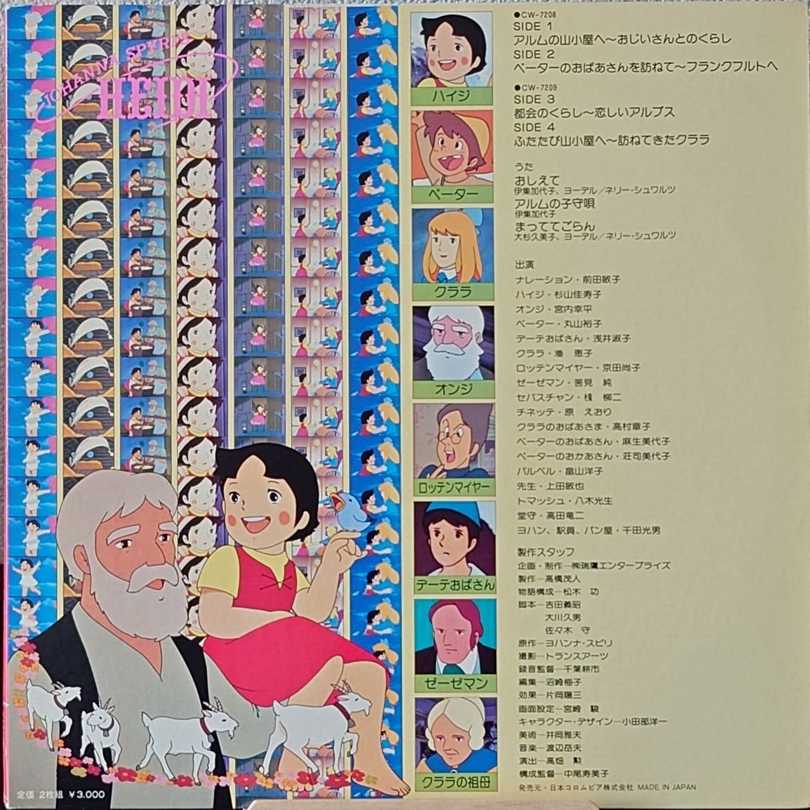 世界名作劇場 < 飄零燕 - 阿爾卑斯山的少女 > 1979 LP黑膠專輯 (共2碟) 世界名作劇場 < アルプスの少女ハイジ > 1979 LP レコード (2枚組) 日本生產 / Made in Japan LP 唱片狀況良好沒有花痕附側紙, 內附罕有彩頁拉頁歌紙, 屬飄零燕FANS必存罕有珍品. 由於年代久遠封套及內頁出現少許歲月痕跡, 決定購買前請小心考慮, 不設退換. 一般可在石硤尾站交收, 另可按買家需要安排順豐到付送貨. 曲目/SONG LIST CW-7208 A1 アルムの山小屋へ A2 おじいさんとのくらし A3 おしえて B1 ペーターのおばあさんを訪ねて B2 フランクフルトへ CW-7209 C1 都会のくらし C2 恋しいアルプス D1 ふたたび山小屋へ D2 訪ねてきたクララ D3 アルムの子守唄 D4 まっててごらん