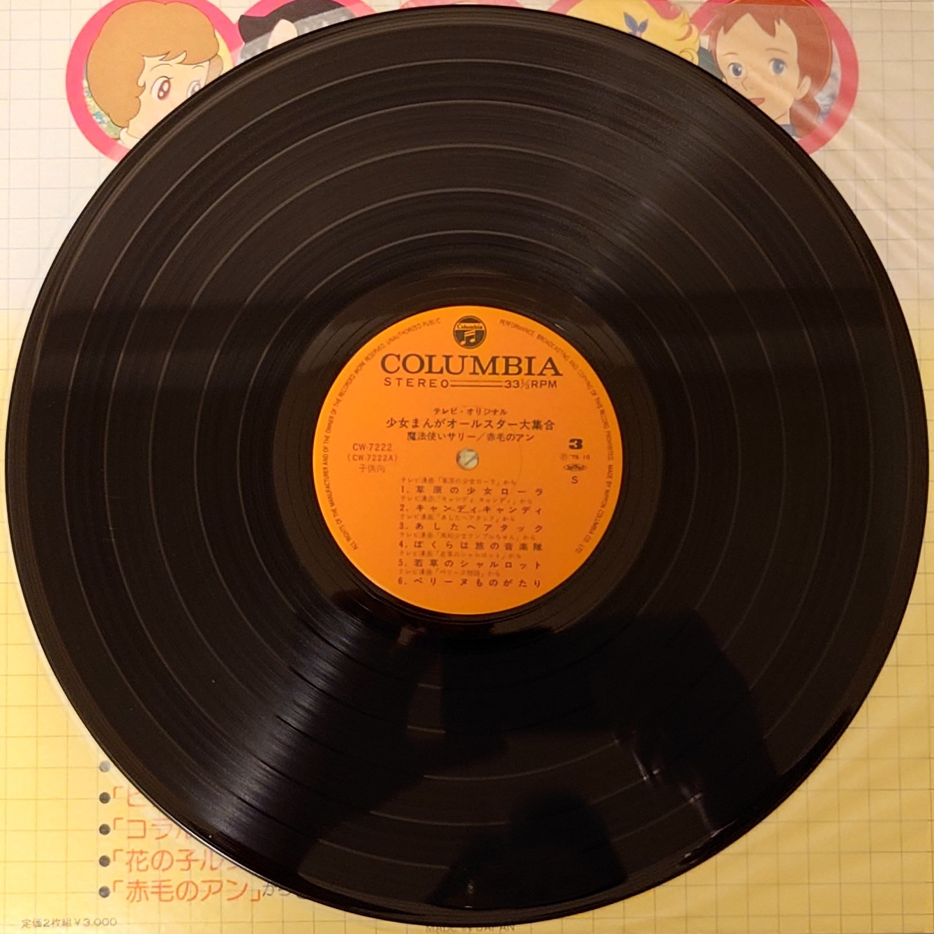 經典少女動畫 < 美少女動漫All Star大集合 > 1979 LP黑膠唱片(共2碟) 昭和アニメ漫画 < 少女まんがオールスター大集合 > 1979 LPレコード (共2枚) 主打動漫主題歌/片尾歌包括: 魔法使莎莉, 藍寶石王子, 小魔鏡, 排球甜心, 魔法人魚真子, 神奇小丫頭, 神化嬌嬌女, 甜心戰士, 奇蹟少女理美, 飄零燕, 小仙女, 紅花俠影, 草原少女蘿拉, 小甜甜, 排球英雌, 彩雲仙子, 少女夏洛特, 小英的故事, 魔女Tickle, 窈窕淑女, 粉紅佳人物語:榮光之天使, 無尾熊的冒險, 花仙子, 安妮的故事等24首名主題曲. 日本生產 / Made in Japan LP 唱片狀況良好沒有花痕連側紙, 唱片集合70, 80年代24首熱門少女動漫主題歌/片尾歌, 屬罕有珍藏品. 封套及內頁由於年代久遠難免出現少許歲月痕跡, 決定購買前請小心考慮, 不設退換. 一般交收在石硤尾站, 可按買家需要另行安排順豐送貨. 曲目/SONG LIST SIDE 1 1. 「魔法使いサリー」から 魔法使いサリー 2. 「リボンの騎士」から リボンの騎士 3. 「ひみつのアッコちゃん」から ひみつのアッコちゃん 4. 「アタックNo.1」から アタックNo.1 5. 「魔法のマコちゃん」から 魔法のマコちゃん 6. 「さるとびエッちゃん」から エッちゃん SIDE 2 1. 「ふしぎなメルモ」から ふしぎなメルモ 2. 「キューティーハニー」から キューティーハニー 3. 「ミラクル少女リミットちゃん」から 幸わせを呼ぶリミットちゃん 4. 「アルプスの少女ハイジ」から おしえて 5. 「魔女っ子メグちゃん」から 魔女っ子メグちゃん 6. 「ラ・セーヌの星」から ラ・セーヌの星 SIDE 3 1. 「草原の少女ローラ」から 草原の少女ローラ 2. 「キャンディ キャンディ」から キャンディ キャンディ 3. 「あしたへアタック」から あしたへアタック 4. 「風船少女テンプルちゃん」から ぼくらは旅の音楽隊 5. 「若草のシャルロット」から 若草のシャルロット 6. 「ペリーヌ物語」から ペリーヌものがたり SIDE 4 1. 「魔女っ子チックル」から 魔女っ子チックル 2. 「はいからさんが通る」から はいからさんが通る 3. 「ピンクレディー物語・栄光の天使たち」から 星から来た二人 4. 「コラルの探検」から 3人のうた 5. 「花の子ルンルン」から 花の子ルンルン 6. 「赤毛のアン」から きこえるかしら