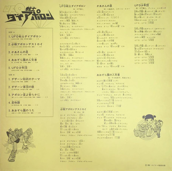 超級機械人 <太保郎 > 1976 LP黑膠專輯 スーパーロボット <UFO戦士 ダイアポロン > 1976 LP レコード 日本生產 / Made in Japan LP 唱片狀態良好沒花痕附側紙, 並保留極罕有拉頁海報. "大保郎"黑膠LP大碟即使在日本本土亦是難得一見的超珍藏品. 附側紙及海報更是罕中之罕. 出品由於年代久遠難免出現若干歲月痕跡, 決定購買前請小心考慮, 不設退換. 一般交收在石硤尾站, 可按買家需要另行安排順豐送貨. 曲目/SONG LIST A1 UFO戦士ダイアポロン A2 必殺アポロンデストロイ A3 かあさんの星 A4 あおぞら園の人気者 A5 UFO少年団 B1 ダザーン総統のテーマ B2 ダザーン軍団の歌 B3 アポロン星よ安らかに B4 星物語 B5 あおぞら園のうた
