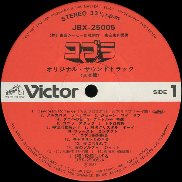 寺沢武一 < 哥布拉 / 音樂編 > 1982 LP黑膠唱片 寺沢武一 < コブラ / 音楽篇) > 1982 LPレコード 日本生產 / Made in Japan LP 唱片狀況良好附側紙, . 由於年代久遠封套及內頁出現若干歲月痕跡, 決定購買前請小心考慮, 不設退換. 一般在石硤尾站交收, 另可按買家要求安排順豐送貨. 収録曲/TRACK LIST A1 Daydream Romance (松崎しげる A2 タルカロス・ランデブー A3 ジェーン・マイ・ラブ A4 ダコバの首 A5 タートル号 発進 A6 コブラ・アタック A7 トポロ教授 A8 宇宙刑務所シド A9 対決クリスタル・ボーイ A10 ファースト・コンタクト A11 コブラ絶体絶命 A12 キャサリンとの再会 A13 愛に包まれて A14 愛のソルフェジェット B1 ドミニクと光る馬 B2 ディスコ・コスモ B3 スノウ・ゴリラの襲撃 B4 コブラの追跡 B5 ドミニクの愛 B6 スノウ・ゴリラ・ダウン B7 ミロスの掟 B8 コブラのテーマ1 B9 コブラの悲しみ B10 ミロス星への接近 B11 ミロスの門 B12 ブラック・ゴッドのテーマ B13 コブラのテーマ2 B14 Stay…