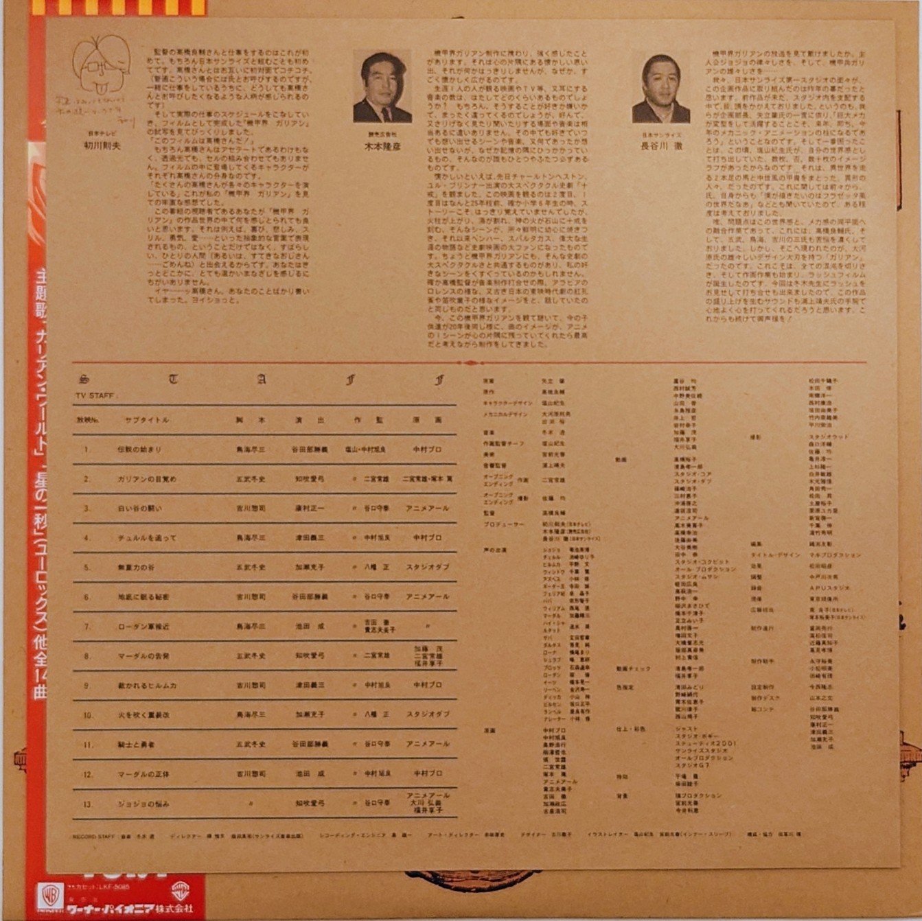 高橋良輔 < 機甲界加利安 音樂集 Vol.1 > 1984 LP黑膠專輯 高橋良輔 < 機甲界ガリアン 音楽集 Vol.1 > 1984 LPレコード 日本製/Made In Japan LP 唱片狀況良好沒有花痕附側紙, 封面由塩山紀生老師繪製, 別具珍藏意義. 封套及內頁由於年代久遠難免出現少許歲月痕跡, 決定購買前請小心考慮, 不設退換. 一般可在石硤尾站交收, 另可按買家需要安排順豐到付送貨. 曲目/SONG LIST A1 伝説 (プロローグ)~ガリアン・ワールド A2 ボーダー王国 A3 危機 A4 勇戦ガリアン A5 安住の地 A6 老騎士アズベス A7 神秘の扉 B1 ジョジョとチュルル B2 戦慄 B3 ロロップルの襲撃 B4 救世主 B5 ほのかな想い B6 戯れ B7 星の1秒