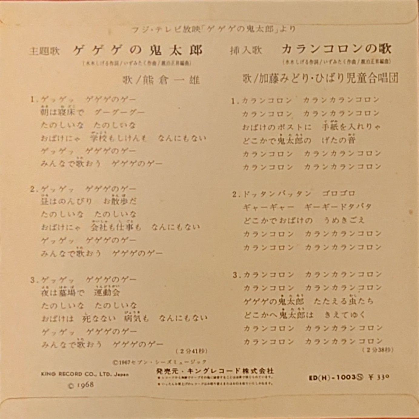 水木茂 < 鬼太郎 > 1968 EP黑膠唱片 水木しげる < 鬼太郎 > 1968 EPレコード 日本生產 / Made in Japan EP 唱片狀態尚可有若干不影響播放的淺花痕. 由於年代久遠難免出現歲月痕跡, 決定購買前請小心考慮, 不設退換. 一般可在石硤尾站交收, 另可按買家需要安排順豐到付送貨. 曲目/SONG LIST A 熊倉一雄 – ゲゲゲの鬼太郎 2:41 B 加藤みどり, ひばり児童合唱団 – カランコロンの歌 2:38