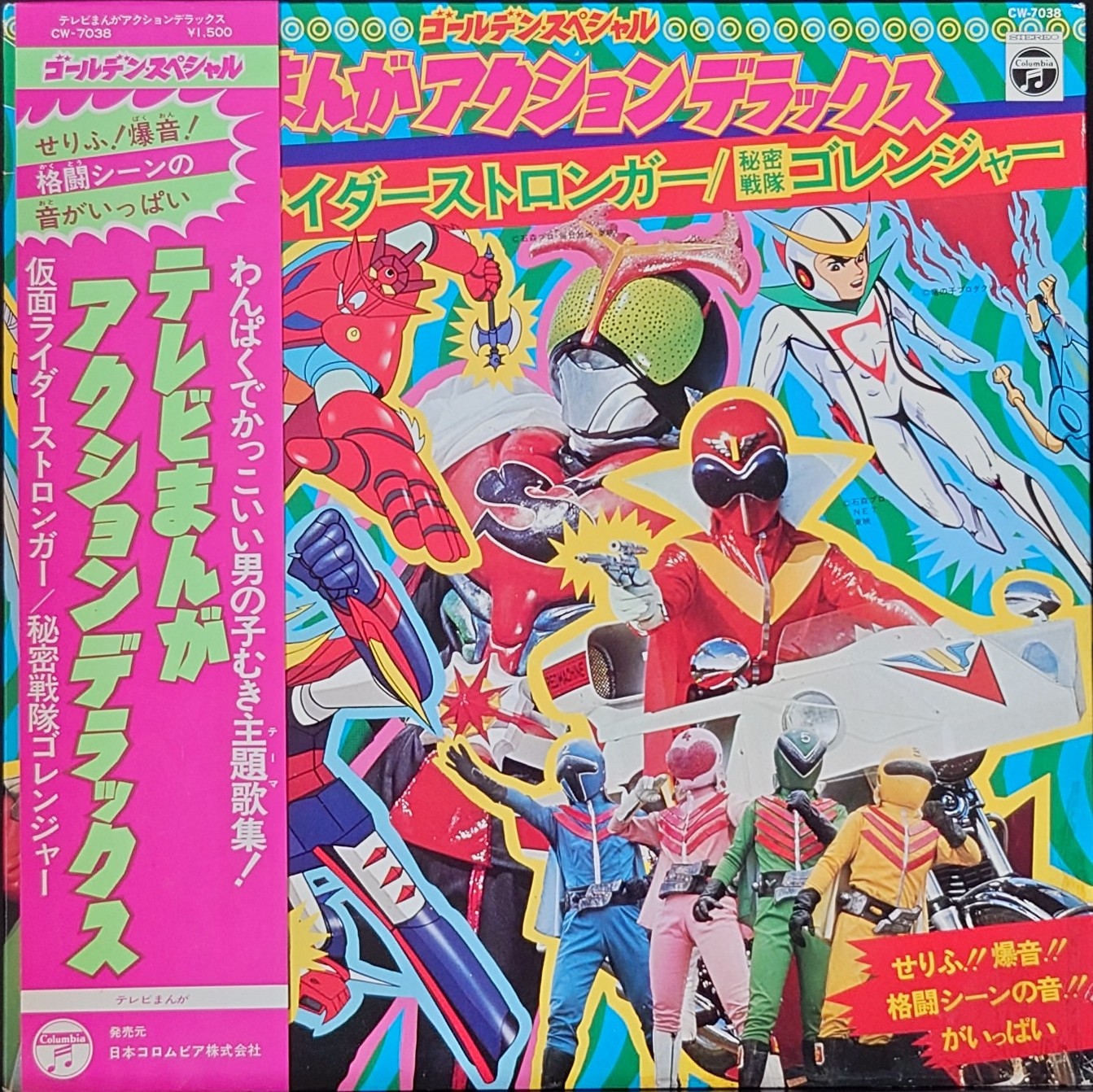 昭和動漫主題曲 < Golden Special電視動漫Action Deluxe > 1975 LP黑膠唱片 アニメ漫画 <ゴールデン・スペシャル・テレビまんがアクション・デラックス > 1975 LPレコード 主打動漫主題歌/片尾歌包括: 五勇士, 冒險蝙蝠猫, 勇者雷登, 幪面超人強者, 再造人卡辛, 新三一萬能俠等12首名主題曲/片尾曲. 日本生產 / Made in Japan LP 唱片狀況良好沒有明顯花痕附側紙. 唱片封套歌詞以個別彩頁方式印製, 屬罕有珍藏品. 封套及內頁由於年代久遠難免出現少許歲月痕跡, 決定購買前請小心考慮, 不設退換. 一般交收在石硤尾站, 可按買家需要另行安排順豐送貨. 曲目/SONG LIST A1 進め!ゴレンジャー A2 秘密戦隊ゴレンジャー A3 冒険ロックバット A4 森のプリンス・ブレイザー A5 勇者ライディーン A6 おれは光だ B1 仮面ライダーストロンガーのうた B2 きょうもたたかうストロンガー B3 たたかえ!キャシャーン B4 俺は新造人間 B5 不滅のマシンゲッターロボ B6 われらのゲッターロボ
