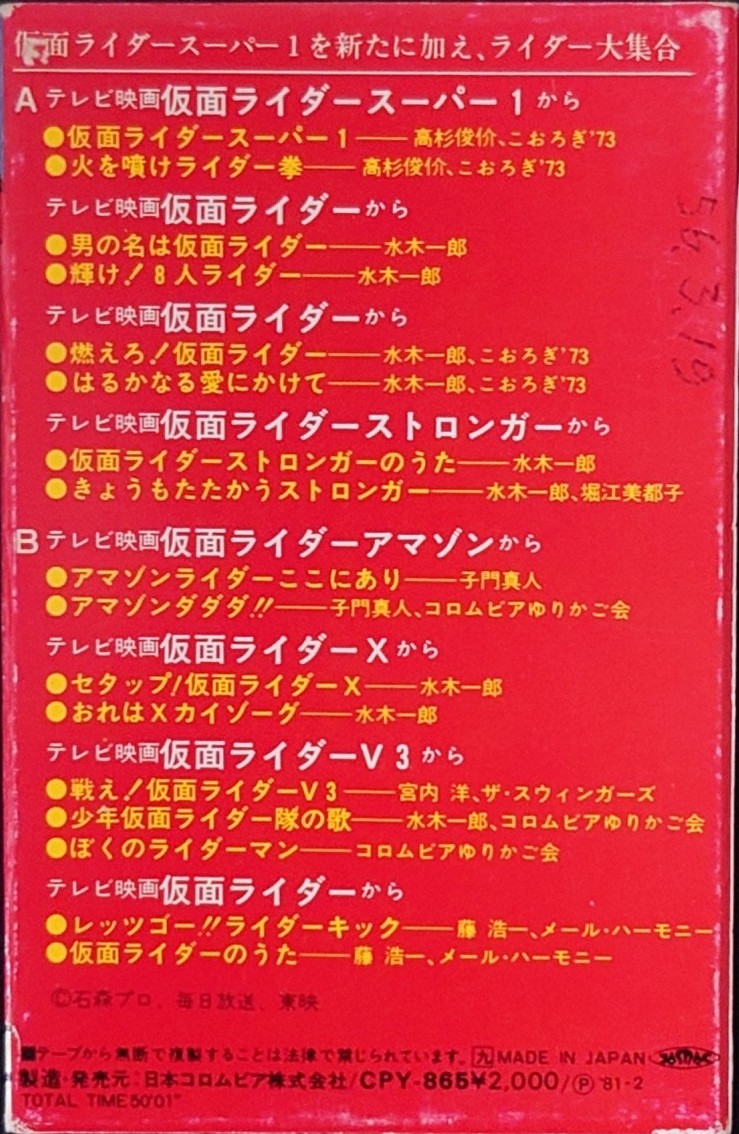 石森章太郎 < 幪面超人Super One新登場 > 1981 卡式錄音帶 石ノ森章太郎 <仮面ライダースーパー1新登場 > 1981 カセットテープ 主打動漫主題歌/片尾歌包括: 由昭和初代幪面超人1號至幪面超Super One期間的主題曲及插入歌等等17首名曲. 日本生產 / Made in Japan 卡式錄音帶狀況良好播放正常, 並附罕有歌紙, 屬罕有珍藏品. 封套及內頁由於年代久遠難免出現若干歲月及使用痕跡, 決定購買前請小心考慮, 不設退換. 一般交收在石硤尾路站, 可按買家需要另行安排順豐送貨. 曲目/SONG LIST テレビ映画 「仮面ライダースーパー1」から A1 仮面ライダースーパー1 A2 火を噴けライダー拳 テレビ映画 「仮面ライダー(スカイライダー)」から A3 男の名は仮面ライダー A4 輝け!8人ライダー テレビ映画 「仮面ライダー(スカイライダー)」から A5 燃えろ!仮面ライダー A6 はるかなる愛にかけて テレビ映画 「仮面ライダーストロンガー」から A7 仮面ライダーストロンガーのうた A8 きょうもたたかうストロンガー テレビ映画 「仮面ライダーアマゾン」から B1 アマゾンライダーここにあり B2 アマゾンダダダ!! テレビ映画 「仮面ライダーX」から B3 セタップ!仮面ライダーX B4 おれはXカイゾーグ テレビ映画 「仮面ライダーV3」から B5 戦え!仮面ライダーV3 B6 少年仮面ライダー隊の歌 B7 ぼくのライダーマン テレビ映画 「仮面ライダー」から B8 レッツゴー!!ライダーキック B9 仮面ライダーのうた