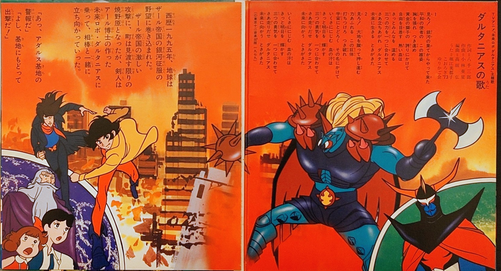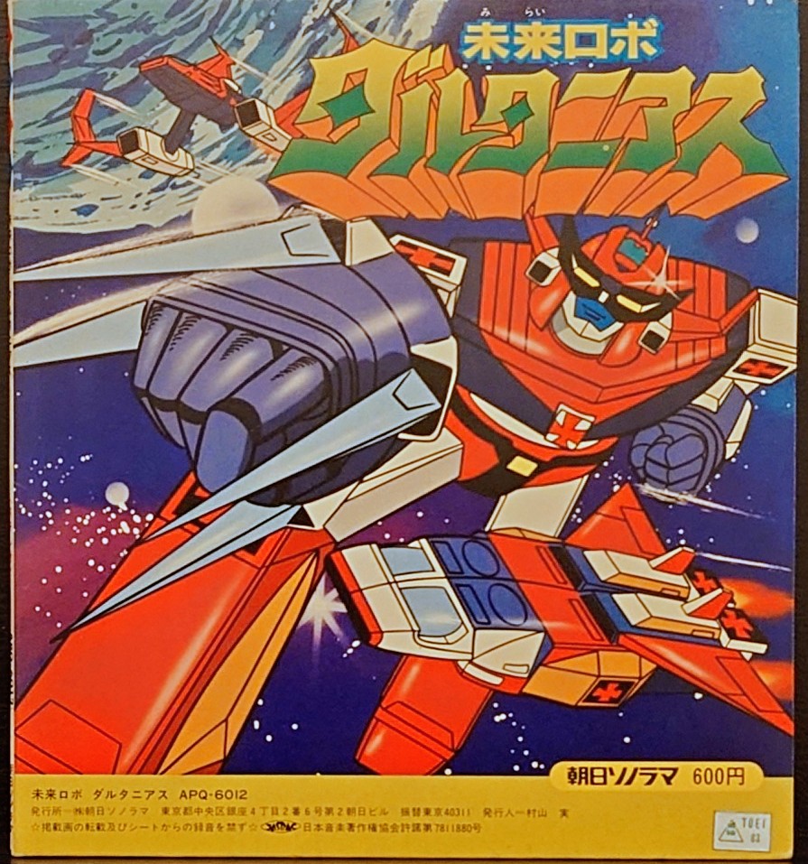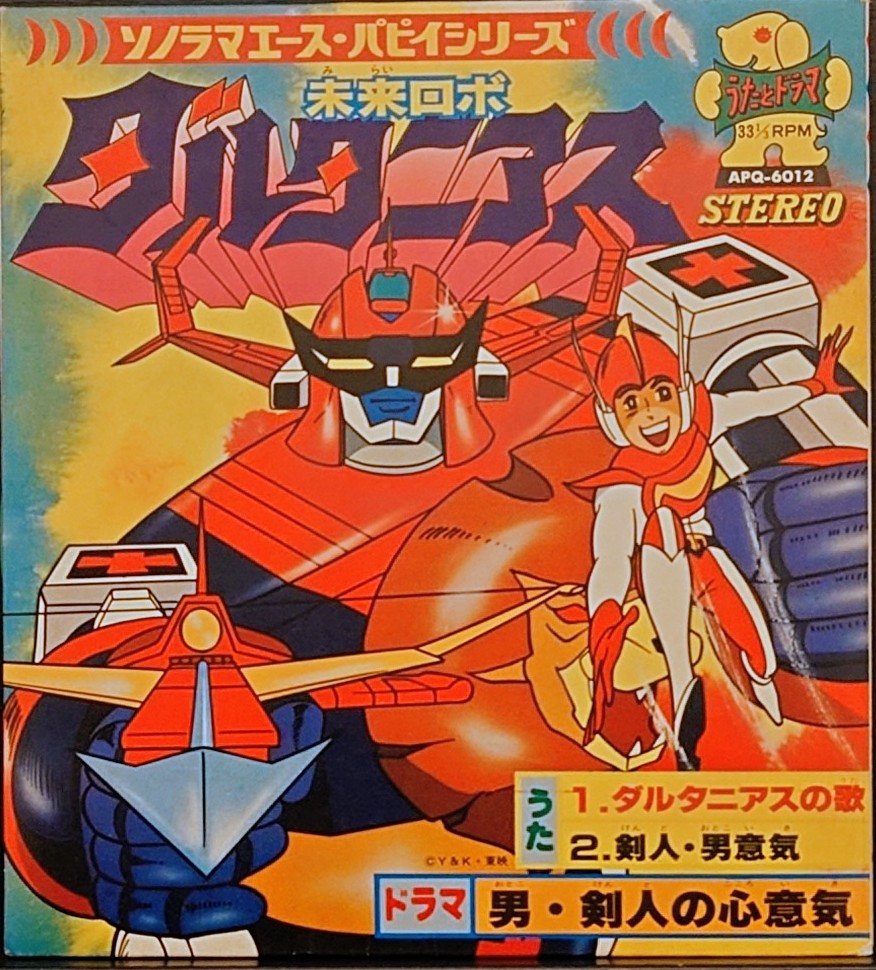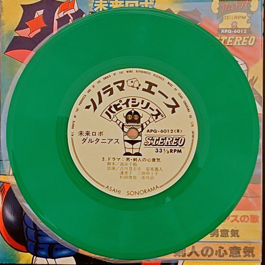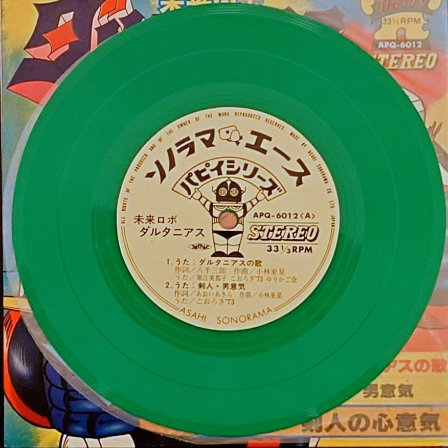 超級機械人 <太空保衛團/ 主題歌/挿入歌/漫畫唱片合集> 1979 EP綠膠唱片 スーパーロボット < 未来ロボダルタニアス / 主題歌/挿入歌 / アニメソノシート> 1979 EPレコード 日本生產 / Made in Japan EP 唱片狀況良好沒有花痕, 唱片封套罕有以漫畫彩頁方式印製, 屬罕有珍藏品. 封套及內頁由於年代久遠難免出現歲月痕跡, 決定購買前請小心考慮, 不設退換. 一般交收在石硤尾站, 可按買家需要另行安排順豐送貨. 曲目/SONG LIST A1 うた:ダルタニアスの歌 A2 うた:剣人・男意気 B ドラマ:男・剣人の心意気