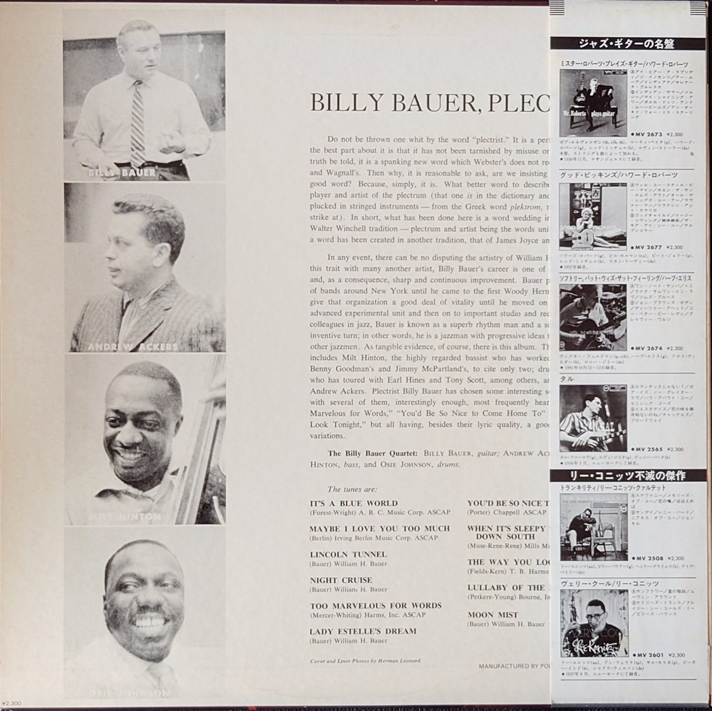 (爵士樂) Billy Bauer < 日版 - Plectrist > 1980 LP黑膠專輯 (ジャズ) ビリー・バウアー < プレクトリスト > 1980 LPレコード 日本生產 / Made in Japan LP 唱片狀況良好沒有花痕並連側紙. 由於年代久遠封套出現若干歲月痕跡, 決定購買前請小心考慮, 不設退換. 一般在石硤尾站交收. 另可按買家需要安排順豐到付送貨. 曲目/SONG LIST A1 It's A Blue World 4:10 A2 Maybe I Love You Too Much 2:31 A3 Lincoln Tunnel 4:05 A4 Night Cruise 4:44 A5 Too Marvelous For Words 2:59 B1 Lady Estelle's Dream 3:39 B2 You'd Be So Nice To Come Home To 3:12 B3 When It's Sleepy Time Down South 3:45 B4 The Way You Look Tonight 3:38 B5 Lullaby Of The Leaves 3:58 B6 Moon Mist 2:11