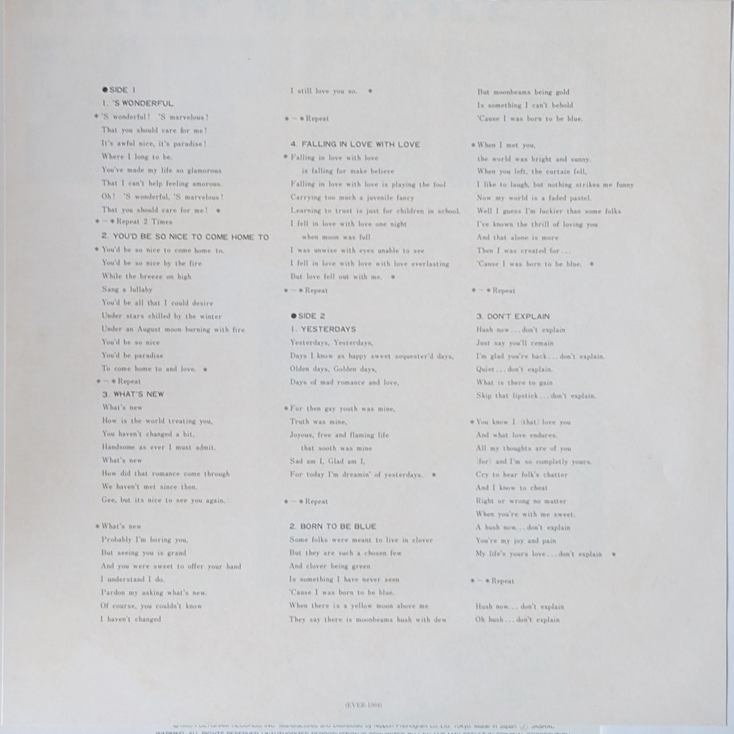 (爵士樂) Helen Merrill<日版 - Helen Merrill>1982 LP黑膠專輯 (ジャズ) ヘレン・メリル< 国内盤 - ヘレン・メリル >1982 LP レコード 日本製 / Made in Japan LP 唱片狀況良好連側紙. 封套及內頁由於年代久遠難免出現少許歲月痕跡, 決定購買前請小心考慮, 不設退換. 一般可在石硤尾站交收, 另可按買家需要安排順豐到付送貨. 曲目/SONG LIST A1 'S Wonderful A2 You'd Be So Nice To Come Home To A3 What's New A4 Falling In Love With Love B1 Yesterdays B2 Born To Be Blue B3 Don't Explain