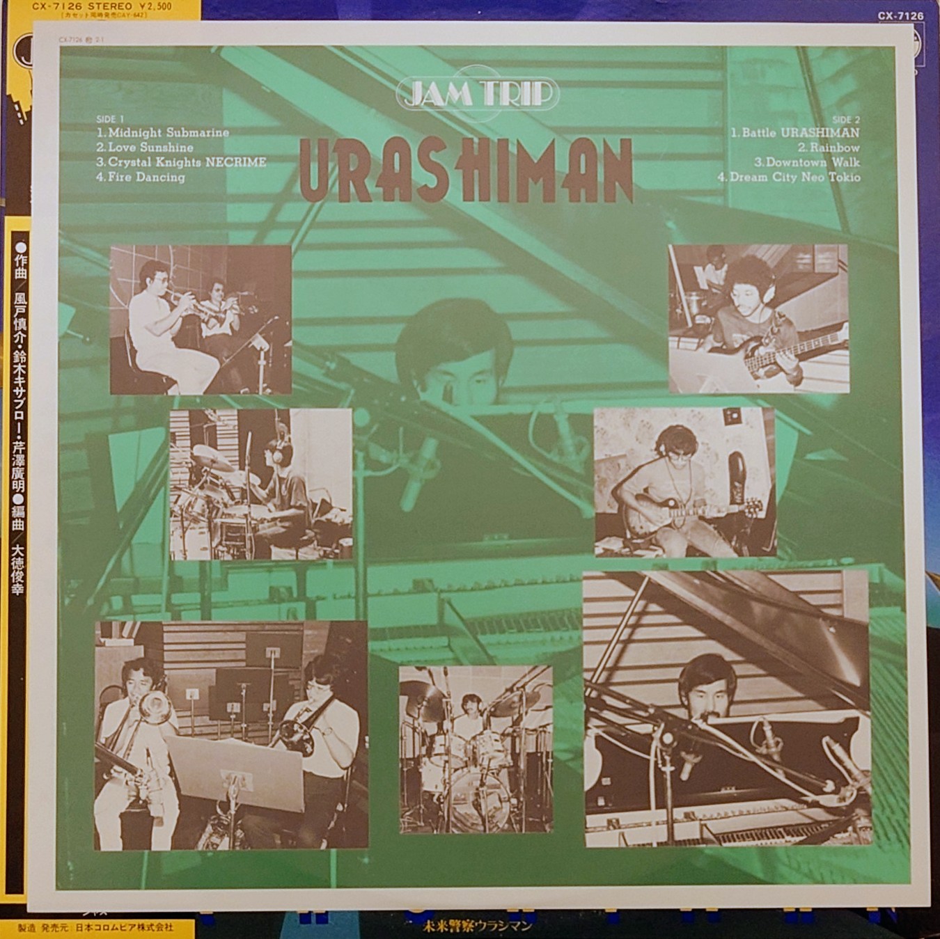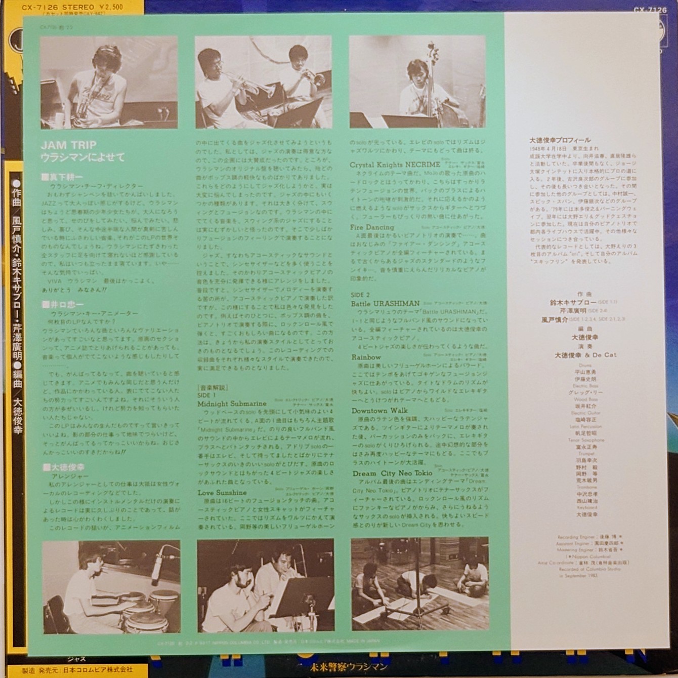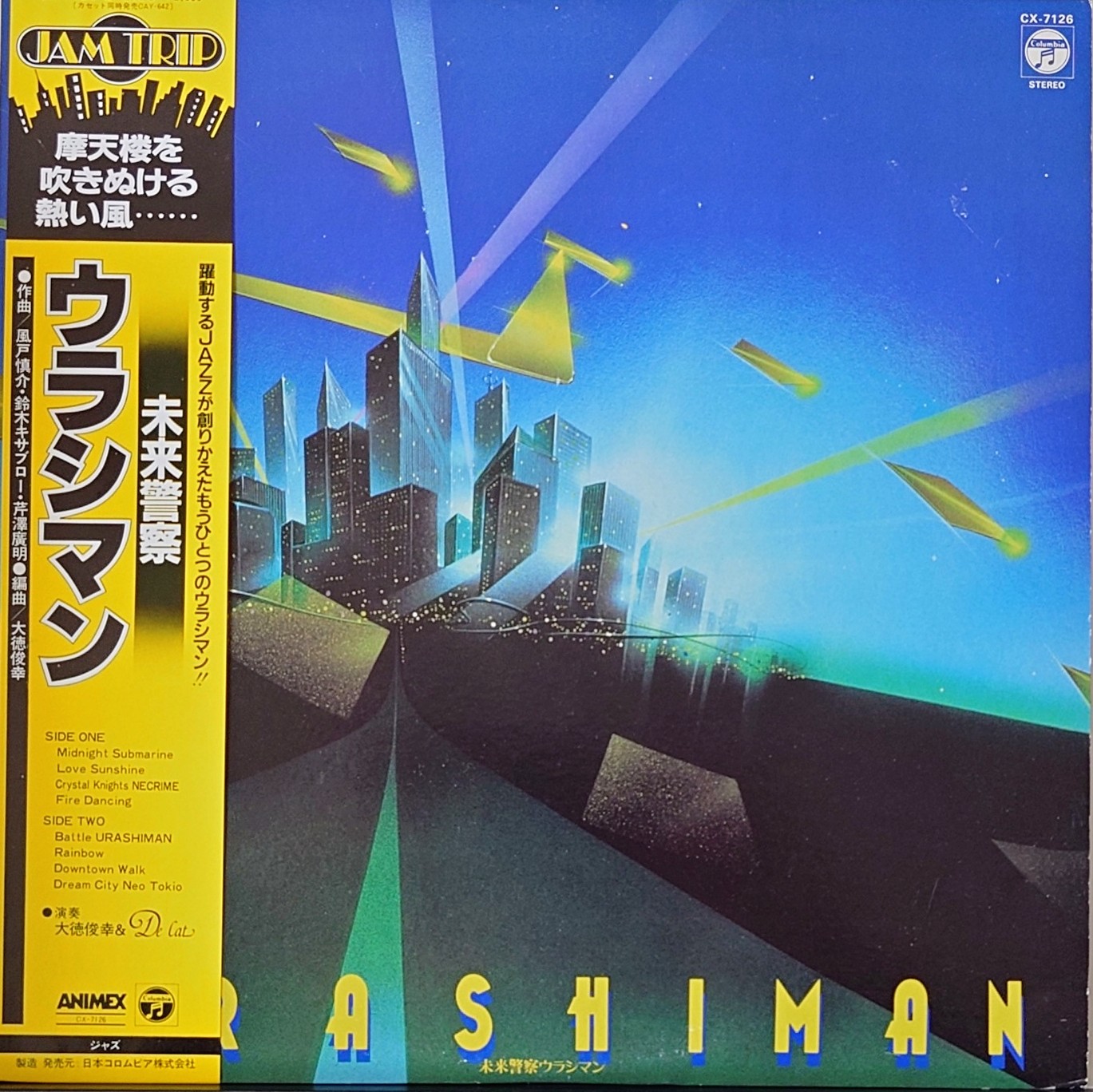 (爵士樂) JAM TRIP < 未來警察 > 1983 LP黑膠專輯 (ジャズ) JAM TRIP < 未来警察ウラシマン > 1983 LPレコード 日本生產 / Made in Japan LP 唱片狀況良好沒有花痕連側紙. 封套及內頁由於年代久遠難免出現少許歲月痕跡, 決定購買前請小心考慮, 不設退換. 一般在石硤尾站交收, 另可按買家需要另行安排順豐送貨. 曲目/SONG LIST A1 Midnight Submarine A2 Love Sunshine A3 Crystal Knights NECRIME A4 Fire Dancing B1 Battle URASHIMAN B2 Rainbow B3 Downtown Walk B4 Dream City Neo Tokio