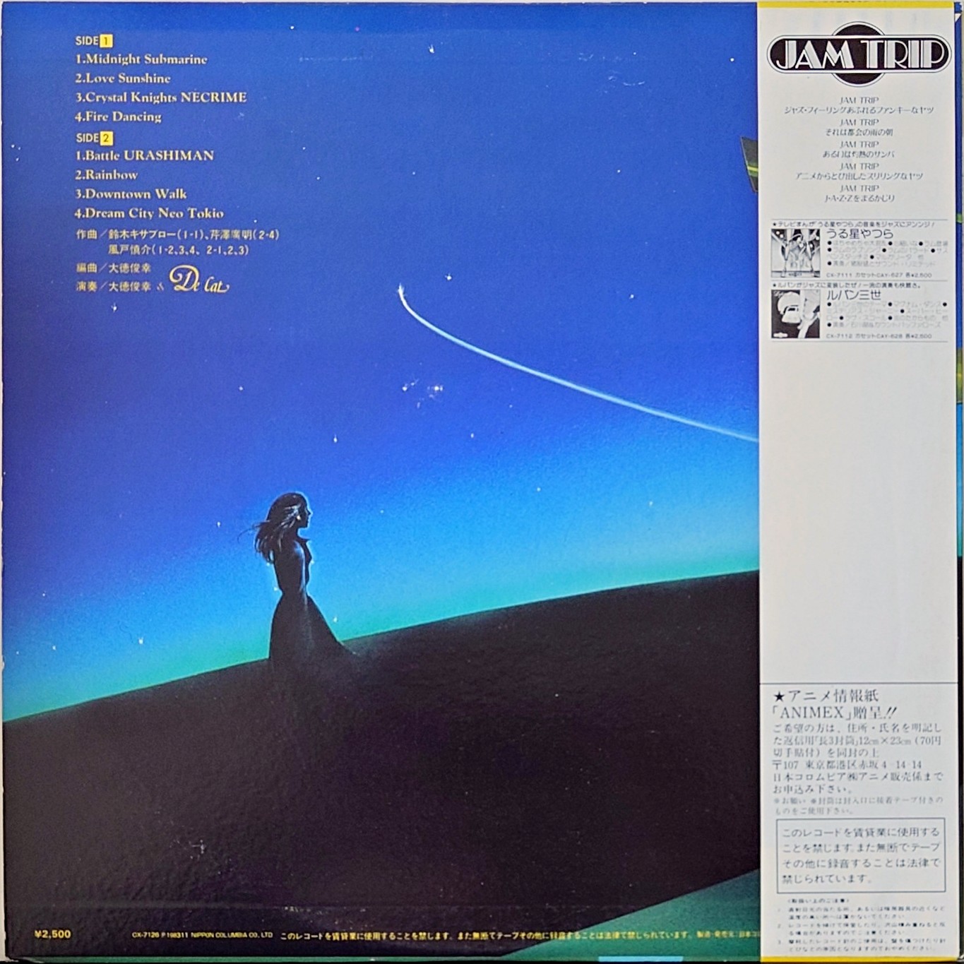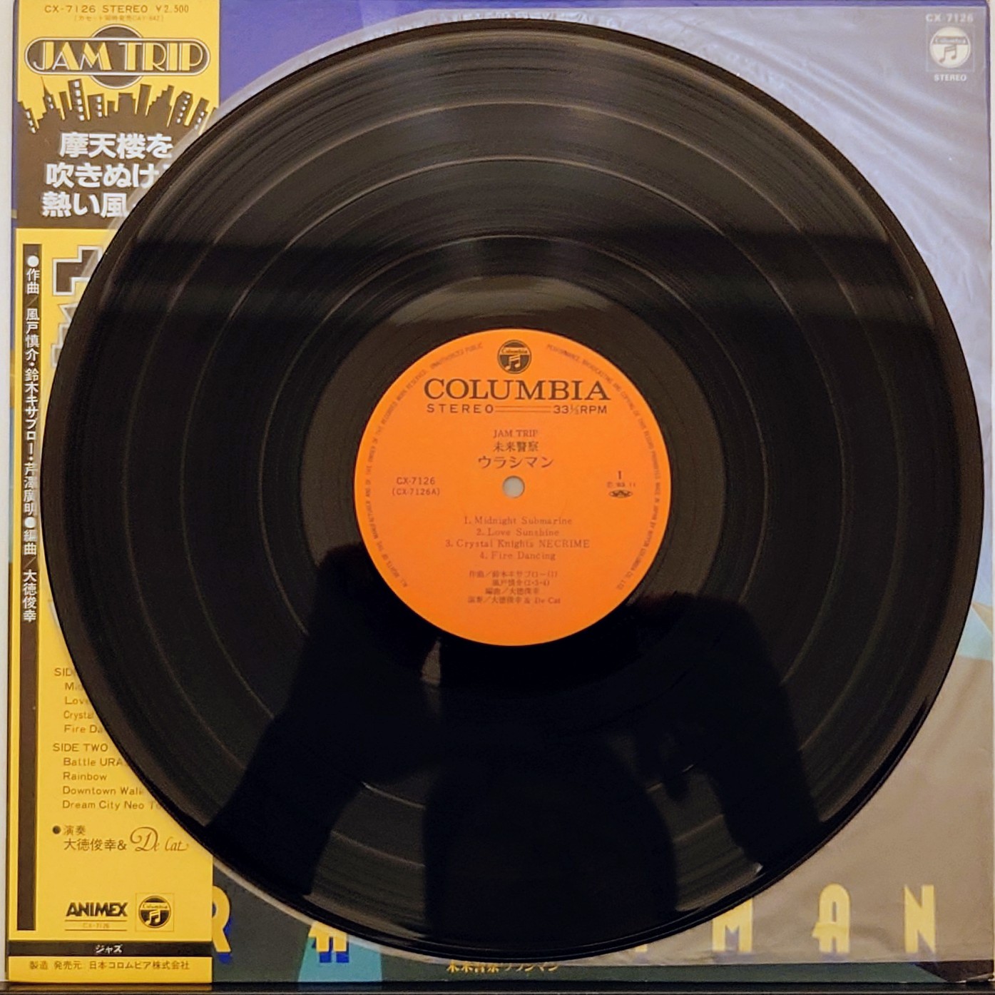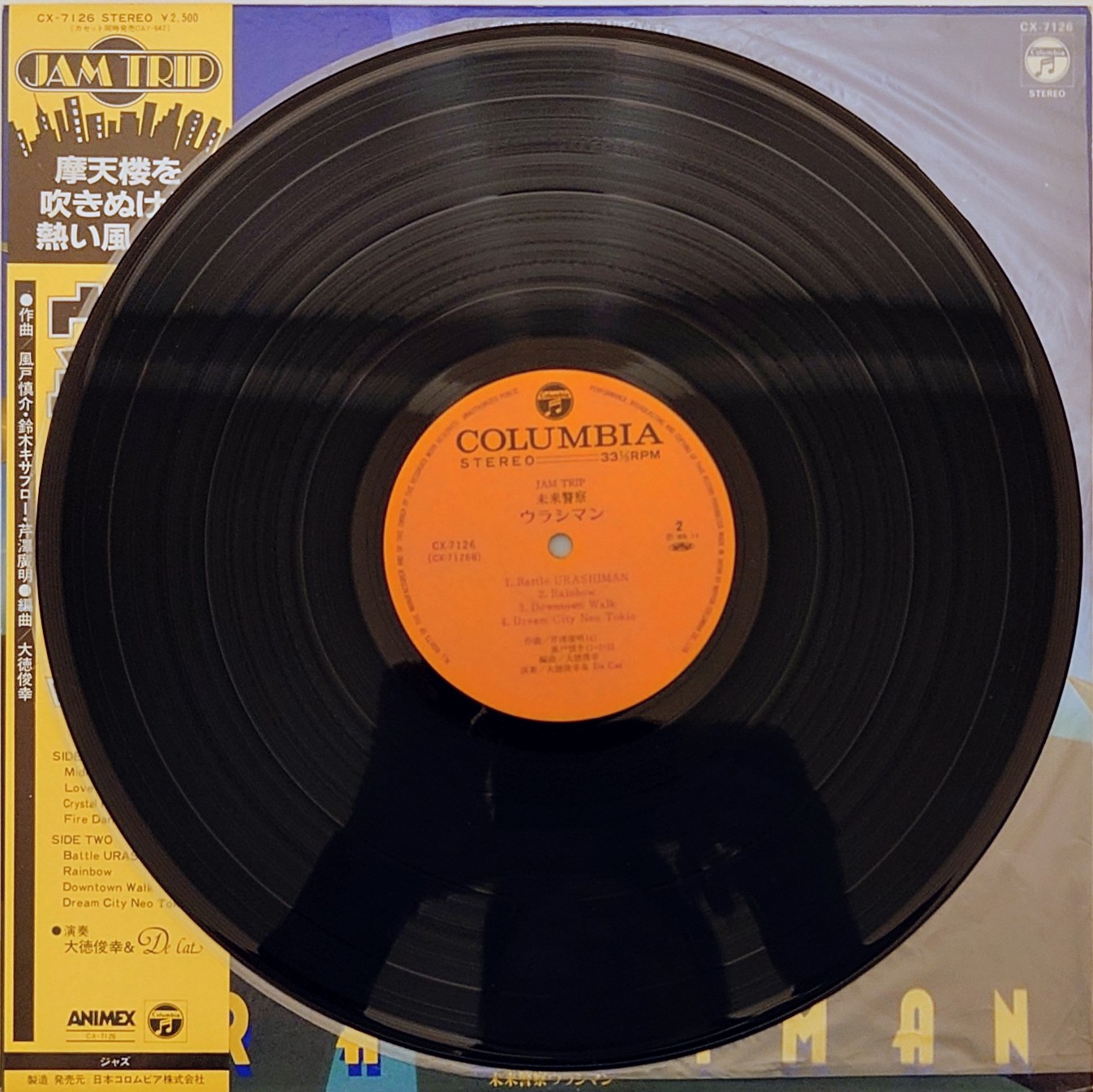 (爵士樂) JAM TRIP < 未來警察 > 1983 LP黑膠專輯 (ジャズ) JAM TRIP < 未来警察ウラシマン > 1983 LPレコード 日本生產 / Made in Japan LP 唱片狀況良好沒有花痕連側紙. 封套及內頁由於年代久遠難免出現少許歲月痕跡, 決定購買前請小心考慮, 不設退換. 一般在石硤尾站交收, 另可按買家需要另行安排順豐送貨. 曲目/SONG LIST A1 Midnight Submarine A2 Love Sunshine A3 Crystal Knights NECRIME A4 Fire Dancing B1 Battle URASHIMAN B2 Rainbow B3 Downtown Walk B4 Dream City Neo Tokio