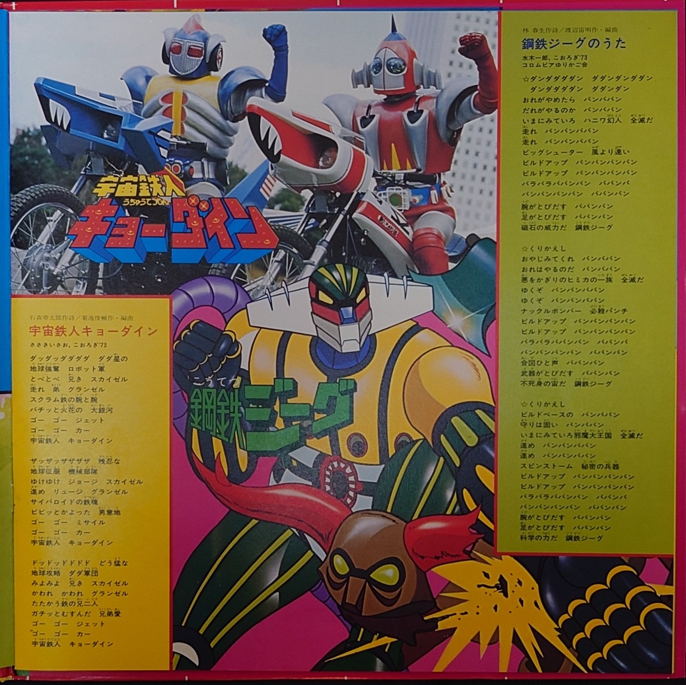日本昭和動漫主題曲 < 黃金電視動漫Double Deluxe > 1976 LP黑膠專輯 (共2碟) 昭和アニメ漫画< ゴールデンテレビまんがダブルデラックス > 1976 LPレコード (共2枚) 主打動漫主題歌/片尾歌包括: 巨靈神, 超神三戰士, 忍者七俠, 影星奇俠, 飛鷹一號, 天地雙龍, 金鋼飛天鑽, 宇宙飛龍, 五勇士, 猫目小僧, 超力電磁俠, 太空小五義, 幪面超人, 再造人卡辛, 機靈小和尚, 大眼睛, 小木偶奇遇記, 小露寶, 紅花俠影, 元祖天才BAKABON, 仙巴歷險記, 萬里尋親記, 義犬報恩, 飄零燕, 小蜜蜂奇遇記, 小仙女, 七小福, 宇宙戰艦大和號等28首名主題曲. 日本生產 / Made in Japan LP 唱片狀態良好沒有明顯花痕連側紙, 唱片封套罕有以彩色拉頁方式印製, 屬罕有珍藏品. 封套及內頁由於年代久遠難免出現歲月痕跡, 決定購買前請小心考慮, 不設退換. 一般可在石硤尾站交收. 另可按買家要求安排順豐到付送貨. 曲目/SONG LIST A1 とべ!グレンダイザー A2 斗え‼︎超人ビビューン A3 斗え忍者キャプター A4 輝く太陽カゲスター A5 ダッシュ!マシンハヤブサ A6 宇宙鉄人キョーダイン A7 剛鉄ジーグのうた B1 大空魔竜ガイキング B2 進め!ゴレンジャー B3 猫目小僧 B4 コン・バトラVのテーマ B5 行くぞ!ゴーダム B6 レッツゴー!!ライダーキック B7 たたかえ!キャシャーン C1 とんちんかんちん一休さん C2 ぐるぐるメダマんおばけだぞ C3 ぼくはピコリーノ C4 おいらロボコンロボットだい! C5 ラ・セーヌの星 C6 タリラリランのコニャニャチワ C7 シンドバッドのぼうけん D1 草原のマルコ D2 よあけのみち D3 おしえて D4 みなしごハッチ D5 魔女っ子メグちゃん D6 ひよ子でしゅら D7 真赤なスカーフ