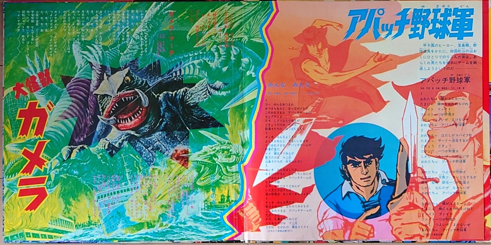 日本昭和動漫 < 動漫與怪獸名作劇場第4集 > LP黑膠唱片 昭和アニメ < マンガと怪獣名作劇場第4集 > LPレコード 主打動漫主題歌包括: 幪面超人, 怪獸卡米拉, 阿帕奇棒球隊及歸來之超人等12首名主題歌, 插入歌及聲音故事內容. 日本生產 / Made in Japan LP唱片狀態保存良好沒花痕. 封套及內頁部份由於年代久遠, 難免出現少許歲月痕跡, 圖片所以見得, 請小心考慮再決定購買, 恕不退換. 一般在石硤尾站交收, 另可按買家需要另行安排順豐送貨. 曲目/SONG LIST A1 うた:レッツゴーライダーキック A2 うた:仮面ライダーのうた A3 ドラマ:吸血ゲバコンドル A4 うた:ガメラマーチ A5 うた:ばくらのガメラ A6 ドラマ:ガメラ対深海怪獣ジゲラ B1 うた:アパッチ野球団 B2 うた:みんな みんな B3 ドラマ:アパッチ野球団誕生 B4 うた:帰ってきたウルトラマン B5 うた:MATチームのうた B6 ドラマ:三大怪獣撃滅命令