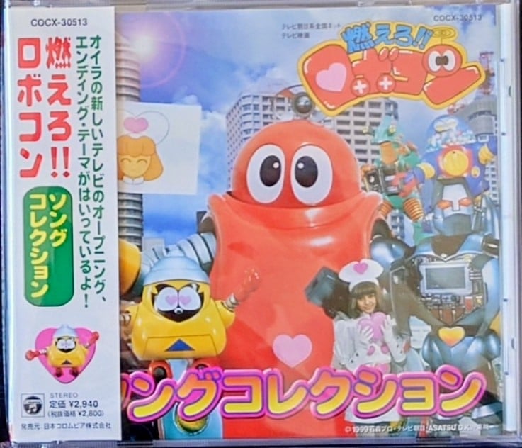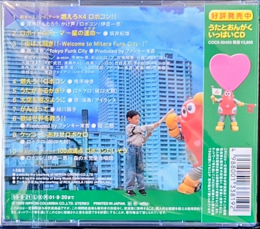 日本特撮 < 燃燒吧!! 小露寶 歌曲合集 > 1999 CD專輯 テレビ映画 < 燃えろ!!ロボコン ソングコレクション > 1999 CDアルバム 日本生產 / Made in Japan CD 唱片狀況近全新沒有花痕附側紙, CD專輯集合特撮片集"燃燒吧!! 小露寶"內各主題歌/片尾曲及背景音樂等, 屬特撮迷罕有珍藏品. 由於年代久遠封套及內頁部份難免出現少許歲月痕跡, 決定購買前請小心考慮, 不設退換. 一般交收在石硤尾鐵路站, 可按買家需要另行安排順豐送貨. 曲目/SONG LIST 1 新オープニング・テーマ燃えろX4ロボコン!! 2 ロボイドのテーマ~星の運命~ 3 「街は大騒ぎ!!-Welcome to Mitara Funk City-」 4 燃えろ!!ロボコン 5 うたがあるかぎり 6 大空を翔ぶように 7 がんばって 8 歌は世界を救う!! 9 ケッコーしあわせロボケロ 10 新エンディング・テーマ100点満点ロボコンたいそう