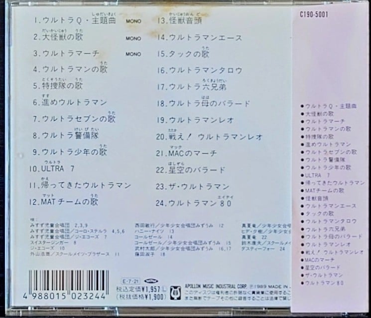 日本特撮 <ULTRAMAN系列大集合> 1989 CD Album 昭和特撮 <ウルトラマンシリーズ大集合 > 1989 CDアルバム 日本製 / Made in Japan CD唱片狀況近全新. 唱片集合70-80年代各ULTRAMAN主題歌及插入歌, 屬日本特撮罕有珍藏品. 封面及內頁由於年代久遠難免出現少許歲月痕跡, 決定購買前請小心考慮, 不設退換. 一般交收在石硤尾站, 可按買家需要另行安排順豐送貨. 曲目/SONG LIST 1 ウルトラQ 主題曲 2 大怪獣の歌 3 ウルトラマーチ 4 ウルトラマンの歌 5 特捜隊の歌 6 進めウルトラマン 7 ウルトラセブンの歌 8 ウルトラ警備隊 9 ウルトラ少年の歌 10 ULTRA 7 11 帰ってきたウルトラマン 12 MAT チームの歌 13 怪獣音頭 14 ウルトラマンエース 15 タックの歌 16 ウルトラマンタロウ 17 ウルトラ六兄弟 18 ウルトラ母のバラード 19 ウルトラマンレオ 20 戦え! ウルトラマンレオ 21 MACのマーチ 22 星空のバラード 23 ザ・ウルトラマン 24 ウルトラマン80