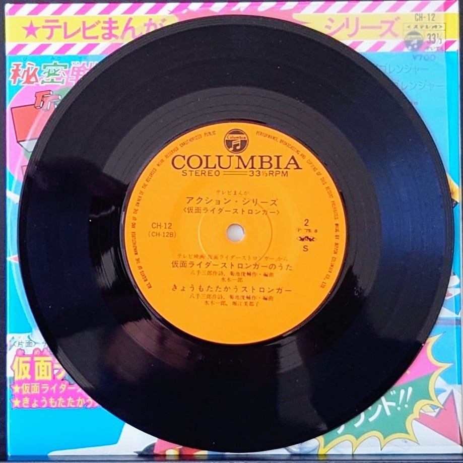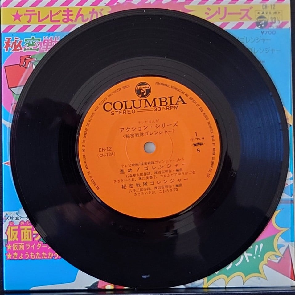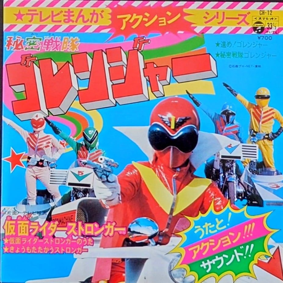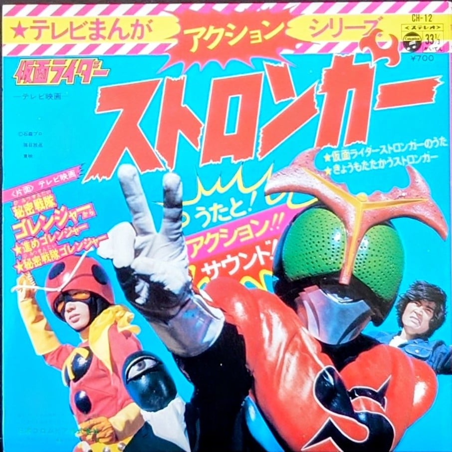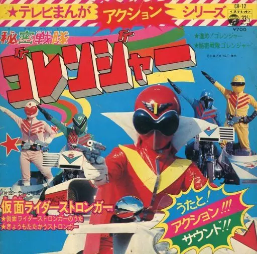 日本特撮 <動漫Action Series /五勇士/幪面超人強者/唱片合集> EP黑膠唱片 日本特撮 <テレビマンガシリーズ/秘密戦隊ゴレンジャー/仮面ライダーストロンガー/コレクション> EP レコード 日本生產 / Made in Japan 主打歌曲包括: 五勇士/幪面超人強者/OP/ED共4首經典歌曲, EP 唱片狀況良好沒有花痕, 唱片封套罕有以彩色拉頁方式印製, 屬罕有珍藏品. 封套及內頁由於年代久遠難免出現少許歲月痕跡, 決定購買前請小心考慮, 不設退換. 一般交收在石硤尾站, 可按買家需要另行安排順豐送貨. 曲目/SONG LIST A1 進め!ゴレンジャー A2 秘密戦隊ゴレンジャー B1 仮面ライダーストロンガー B2 きょうもたたかうストロンガー