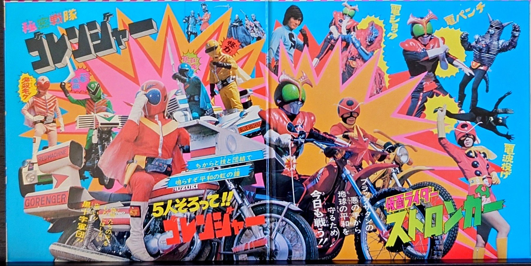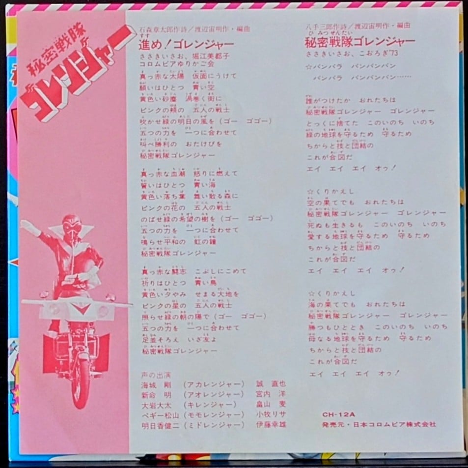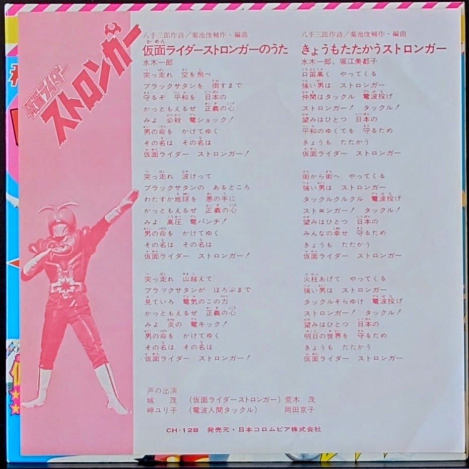 日本特撮 <動漫Action Series /五勇士/幪面超人強者/唱片合集> EP黑膠唱片 日本特撮 <テレビマンガシリーズ/秘密戦隊ゴレンジャー/仮面ライダーストロンガー/コレクション> EP レコード 日本生產 / Made in Japan 主打歌曲包括: 五勇士/幪面超人強者/OP/ED共4首經典歌曲, EP 唱片狀況良好沒有花痕, 唱片封套罕有以彩色拉頁方式印製, 屬罕有珍藏品. 封套及內頁由於年代久遠難免出現少許歲月痕跡, 決定購買前請小心考慮, 不設退換. 一般交收在石硤尾站, 可按買家需要另行安排順豐送貨. 曲目/SONG LIST A1 進め!ゴレンジャー A2 秘密戦隊ゴレンジャー B1 仮面ライダーストロンガー B2 きょうもたたかうストロンガー