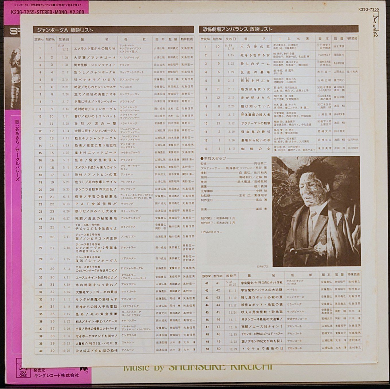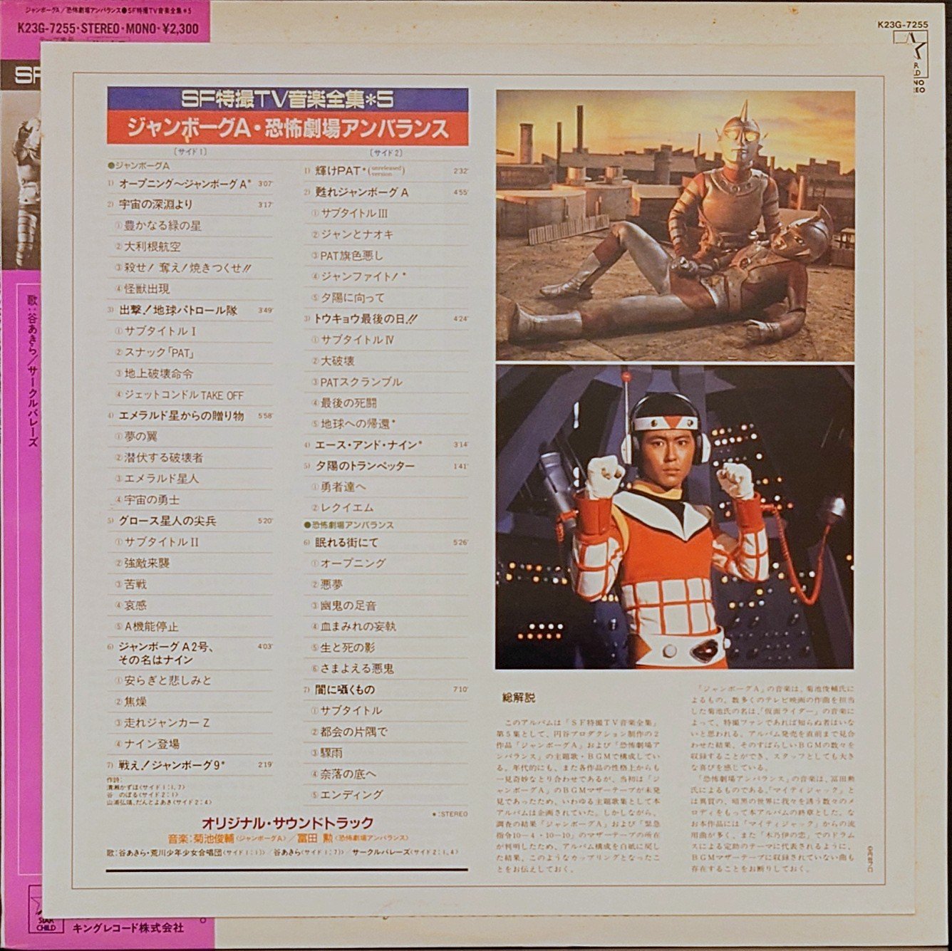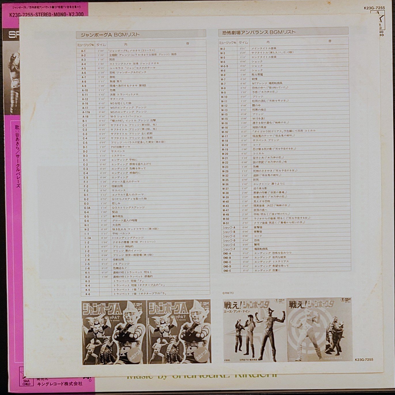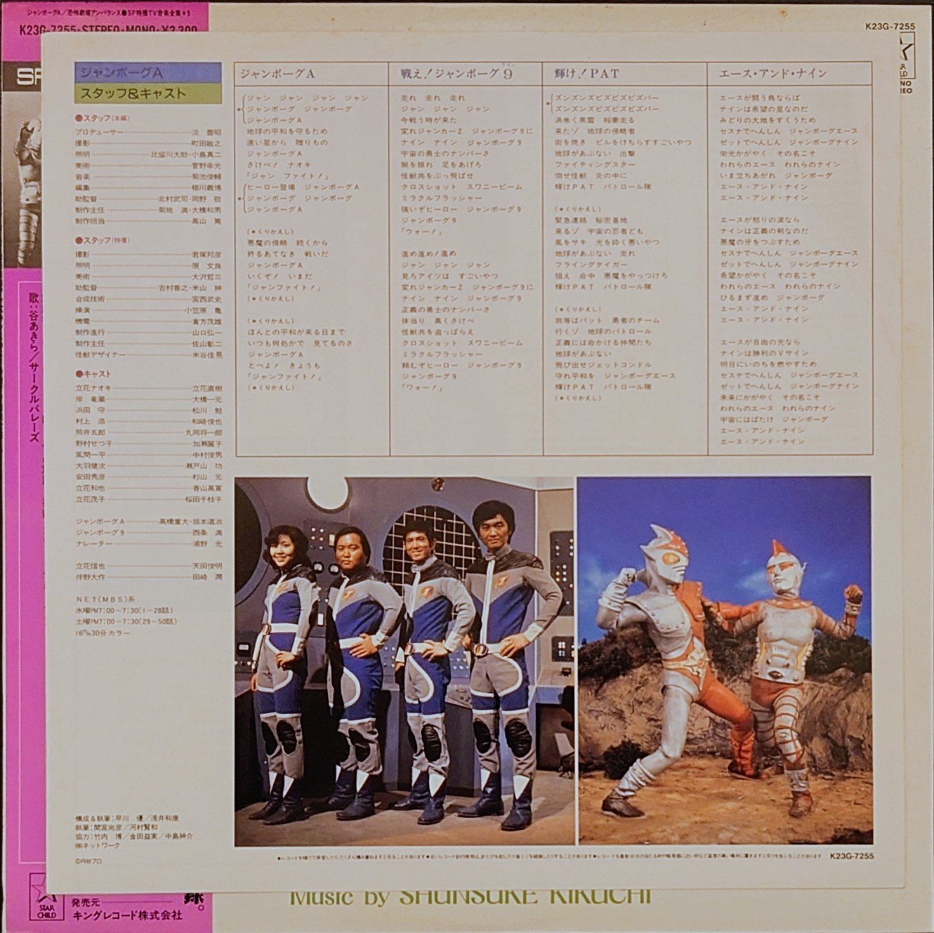 日本特撮 < 珍寶A > 1986 LP 黑膠唱片 日本特撮 < ジャンボーグA > 1986 LP レコード 日本生產 / Made in Japan LP 唱片狀況良好沒有明顯花痕附側紙, 產品由於年代久遠, 封套及內頁由有若干使用及歲月痕跡, 決定購買前請小心考慮, 不設退換. 一般交收在石硤尾鐵路站, 可按買家需要另行安排順豐送貨. 曲目/SONG LIST A1 オープニング~ジャンボーグA 3:07 A2 宇宙の深淵より 3:17 A3 出撃!地球パトロール隊 3:49 A4 エメラルド星からの贈り物 5:58 A5 グロース星人の尖兵 5:20 A6 ジャンボーグA2号、その名はナイン 4:03 A7 戦え!ジャンボーグ9 2:19 B1 輝けPAT(Unreleased Version) 2:32 B2 甦れジャンボーグA 4:55 B3 トウキョウ最後の日!! 4:24 B4 エース・アンド・ナイン 3:14 B5 夕陽のトランペッター 1:41 B6 眠れる街にて 5:26 B7 闇に囁くもの 7:10