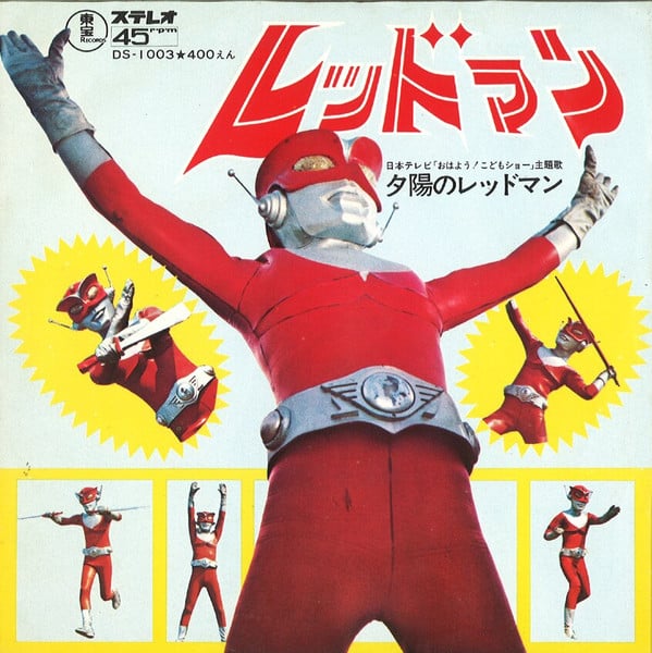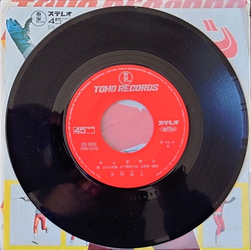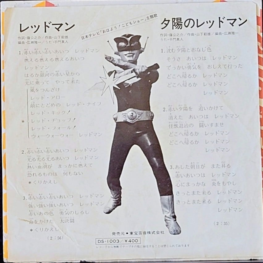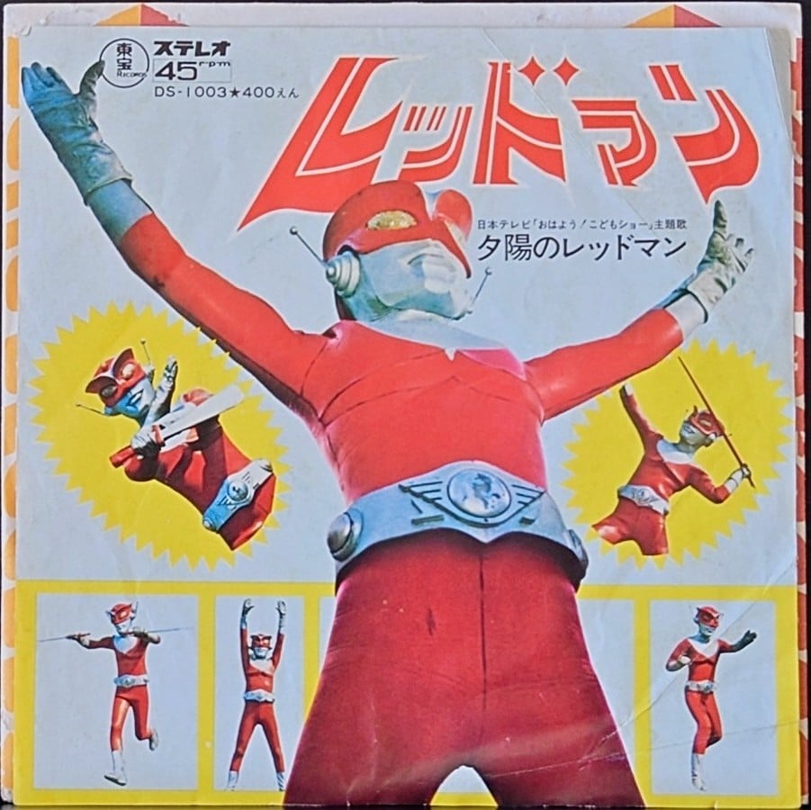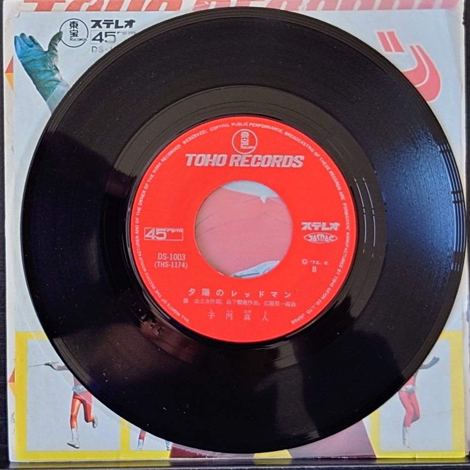 日本特撮 < 紅超人 > 1972 EP黑膠唱片 テレビ映画 < レッドマン > 1972 EPレコード 日本生產 / Made in Japan EP 唱片狀況良好有若干不影響播放的淺花痕, 唱片封套罕有以漫畫彩頁方式印製, 屬罕有珍藏品. 封套及內頁由於年代久遠難免出現歲月痕跡, 決定購買前請小心考慮, 不設退換. 一般在石硤尾站交收, 另可按買家需要另行安排順豐送貨. 曲目/SONG LIST A レッドマン 2:56 B 夕陽のレッドマン 2:35