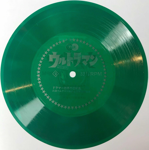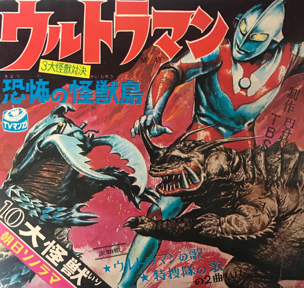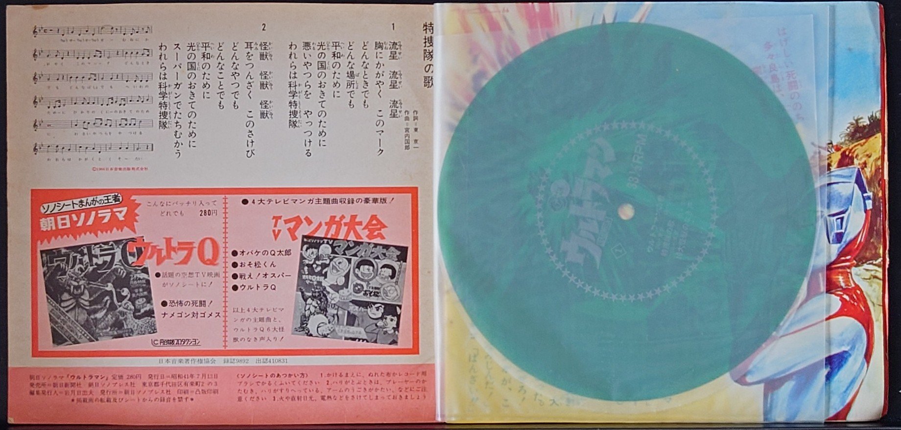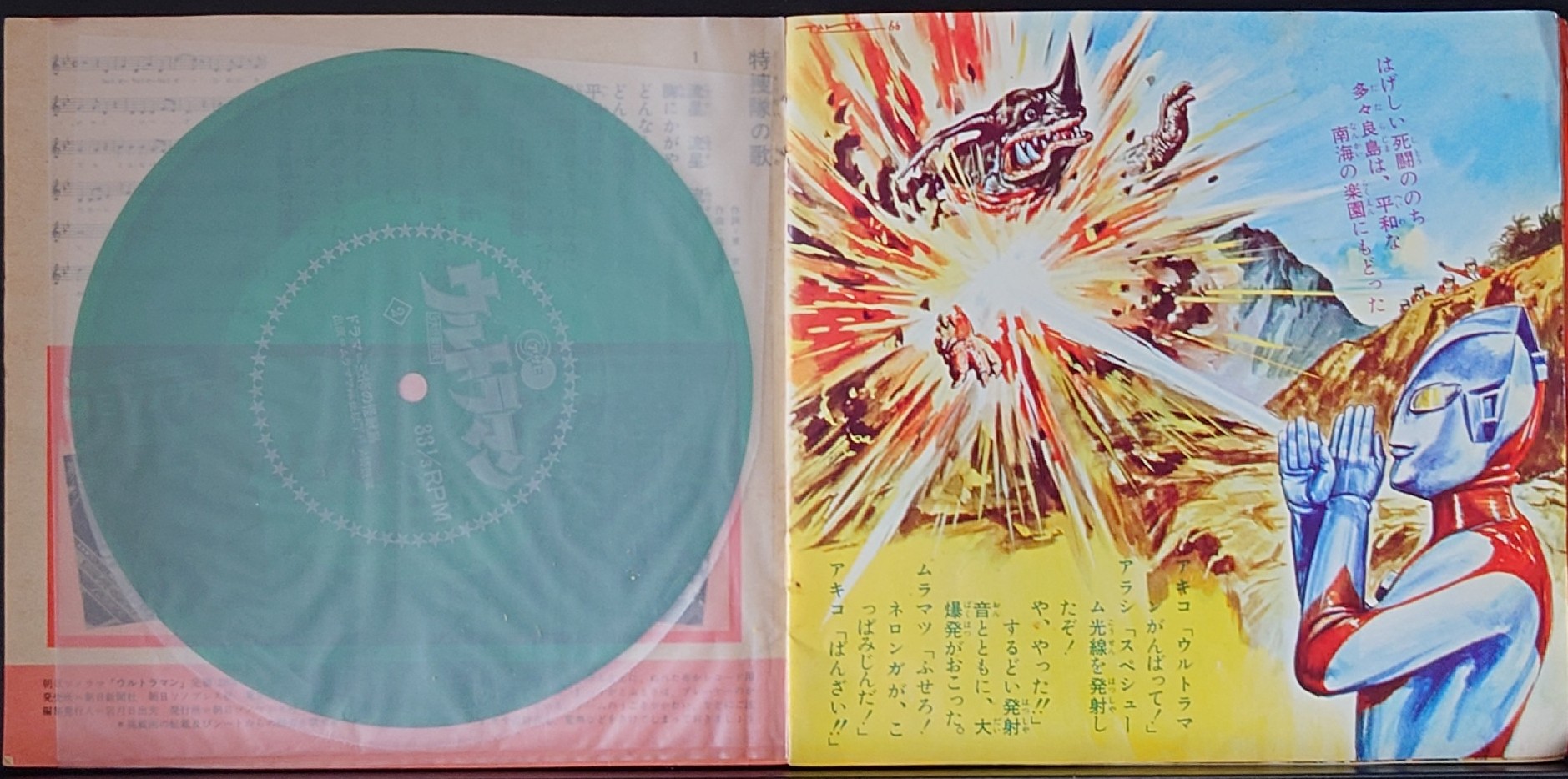 日本特撮 < ULTRAMAN 3大怪獸對決 主題歌漫畫合集 > 1967 EP綠膠唱片 昭和特撮<ウルトラマン3大怪獣対決 まんがソノシート> 1967 EP緑盤レコード 日本生產 / Made in Japan EP 唱片狀況良好沒有花痕, 唱片封套罕有以漫畫彩頁方式印製, 屬罕有珍藏品. 封套及內頁由於年代久遠難免出現歲月痕跡, 決定購買前請小心考慮, 不設退換. 一般交收在石硤尾站, 可按買家需要另行安排順豐送貨. 曲目/SONG LIST A1 ウルトラマンの歌 A2 特捜隊の歌 A3 10大怪獣のなき声 B1 ドラマ=恐怖の怪獣島