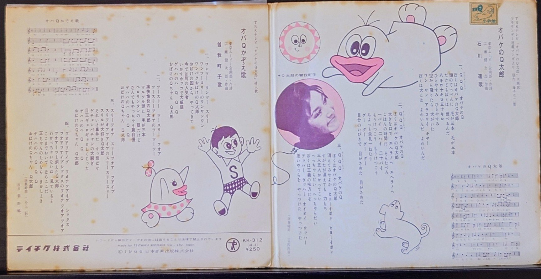藤子不二雄A < Q太郎 / Q太郎計數歌 > 1966 EP黑膠唱片 藤子不二雄 < オバケのQ太郎 / オバQかぞえ歌 > 1966 EP レコード 日本生產 / Made in Japan EP 唱片狀況良好有若干不影響播放的淺花痕. 因年代久遠封套及內頁有若干歲月痕跡, 購買前請小心考慮. 不設退換. 一般交收在石硤尾鐵路站交收, 可按買家需要另行安排順豐送貨. 曲目/SONG LIST A オバケのQ太郎 2:44 B オバQかぞえ歌 2:32