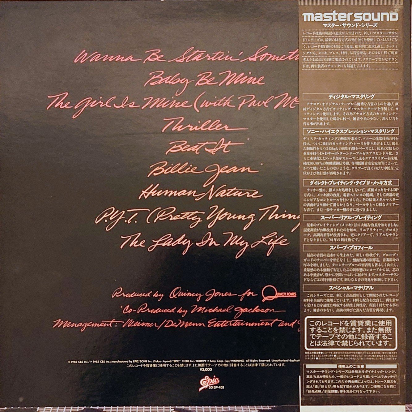 Michael Jackson<日版 - Thriller - Master Sound >1984 LP黑膠專輯 マイケル・ジャクソン < 国内盤 - スリラー - マスター・サウンド >1984 LPレコード 日本製 / Made in Japan LP唱片狀況良好沒有花痕附側紙, 封套及內頁由於年代久遠難免出現少許歲月痕跡, 決定購買前請小心考慮, 不設退換. 一般可在石硤尾站交收, 另可按買家需要安排順豐到付送貨. 曲目/SONG LIST A1 Wanna Be Startin' Somethin' 6:02 A2 Baby Be Mine 4:20 A3 The Girl Is Mine 3:42 A4 Thriller 5:57 B1 Beat It 4:17 B2 Billie Jean 4:57 B3 Human Nature 4:05 B4 P.Y.T. (Pretty Young Thing) 3:58 B5 The Lady In My Life 4:57