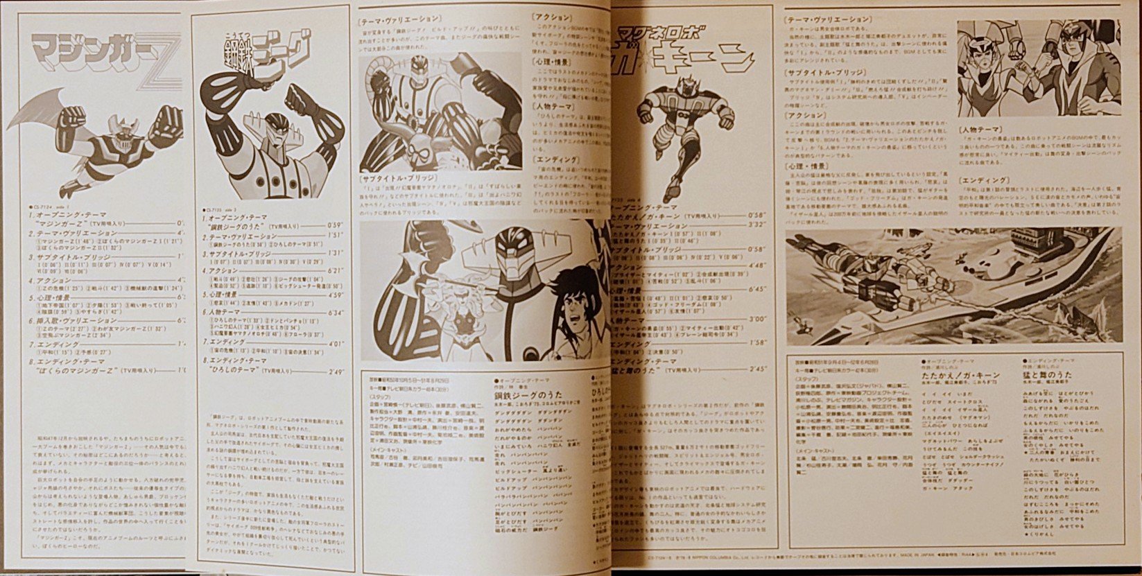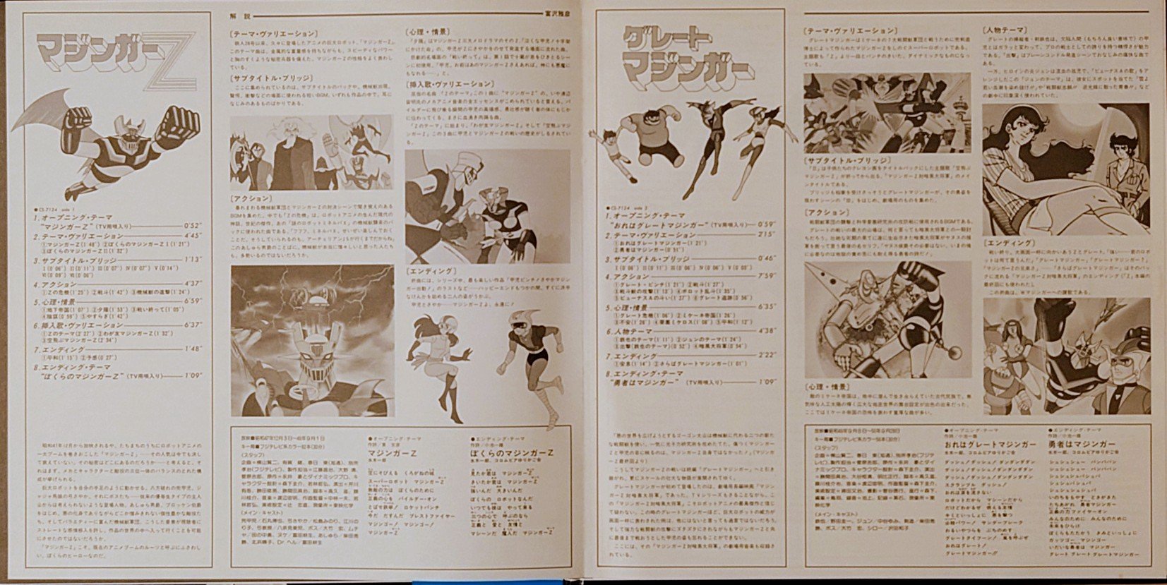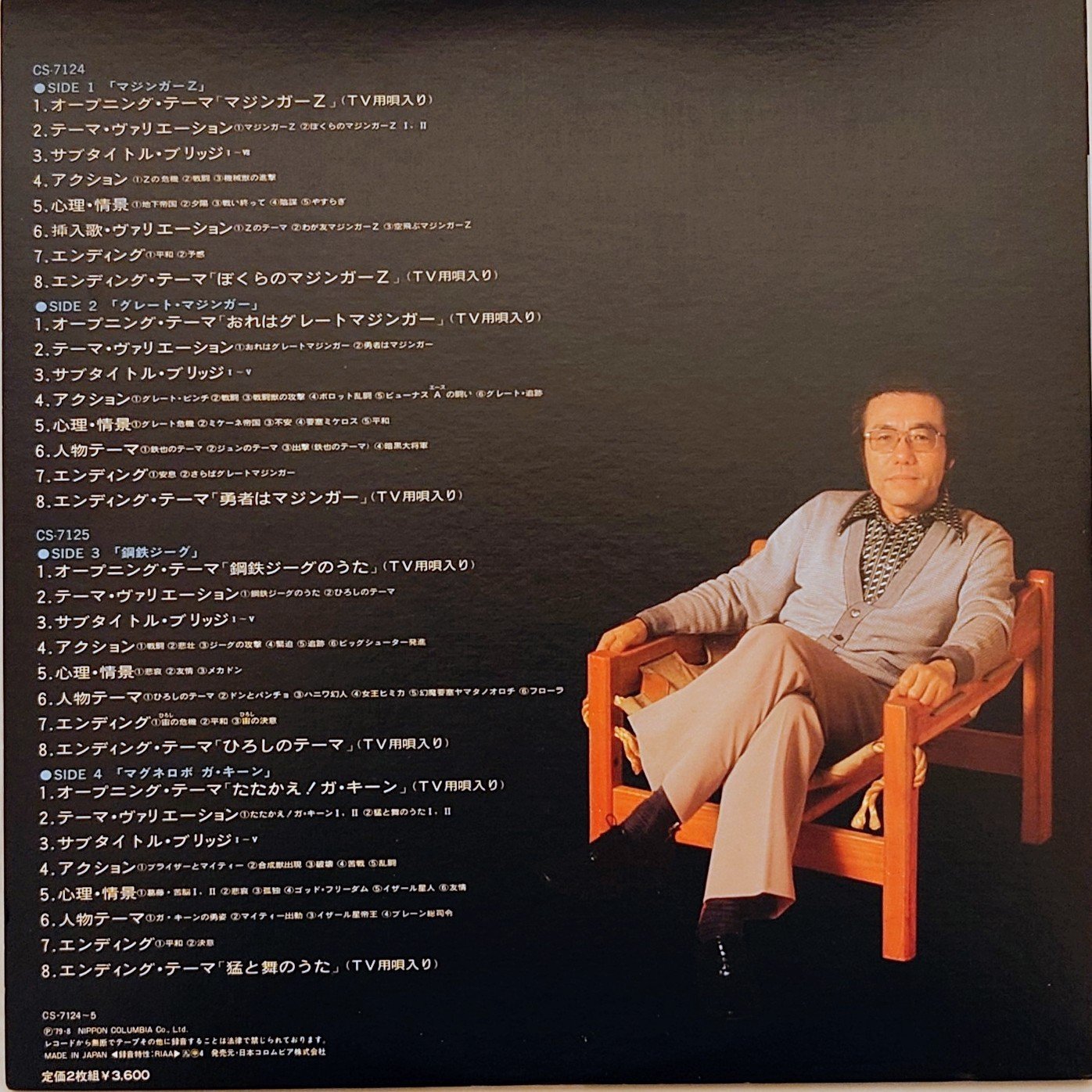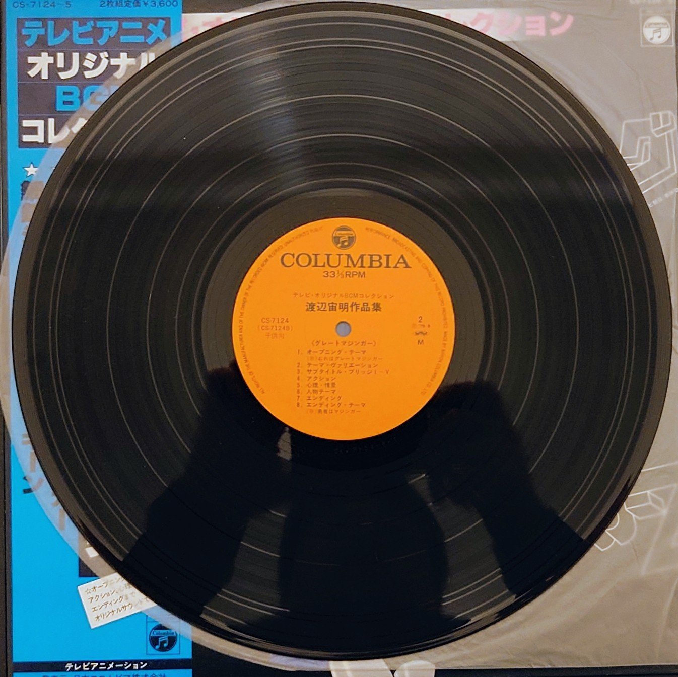 渡邊宙明作品集 <電視動漫主題曲/背景音樂合輯> 1979 LP黑膠珍藏專輯 (共2碟) 渡辺宙明作品集 <テレビ・オリジナルBGMコレクョン> 1979 LP レコード (二枚組) 主打動漫主題歌/背景音樂包括: 鐵甲萬能俠, 鐵甲萬能俠2號, 金鋼飛天鑽, 陰陽電磁俠等36首歌曲及背景音樂. 日本生產 / Made in Japan LP 唱片狀況良好沒有明顯花痕並連側紙, 由於年代久遠封套及拉頁出現若干歲月痕跡, 決定購買前請小心考慮, 不設退換. 一般在石硤尾站交收. 另可按買家需要安排順豐到付送貨. 収録曲/TRACK LIST A1 オープニング・テーマ「マジンガーZ」(Tv用唄入り) A2 テーマ・ヴァリエーション ①マジンガーZ ②ぼくらのマジンガーZ I、Ii A3 サブタイトル・ブリッジ I~Vii A4 アクション ①Zの危機 ②戦斗 ③機械獣の進撃 A5 心理・描写 ①地下帝国 ②夕陽 ③戦い終って ④隠謀 ⑤やすらぎ A6 挿入歌・ヴァリエーション ①Zのテーマ ②わが友マジンガーZ ③空飛ぶマジンガーZ A7 エンディング ①平和 ②予感 A8 エンディング・テーマ「ぼくらのマジンガーZ」(TV用唄入り) B1 オープニング・テーマ「おれはグレート・マジンガー」(TV用唄入り) B2 テーマ・ヴァリエーション ①おれはグレート・マジンガー ②勇者はマジンガー B3 サブタイトル・ブリッジ I~V B4 アクション ①グレート・ピンチ ②戦闘 ③戦闘獣の攻撃 ④ボロット乱闘 ⑤ビューナスAの戦い ⑥グレート追跡 B5 心理・描写 ①グレート危機 ②ミケーネ帝国 ③不安 ④要塞ミケロス ⑤平和 B6 人物テーマ ①鉄也のテーマ ②ジュンのテーマ ③出撃(鉄也のテーマ) ④暗黒大将軍 B7 エンディング ①安息 ②さらば、グレート・マジンガー B8 エンディング・テーマ「勇者はマジンガー」(TV用唄入り) C1 オープニング・テーマ「鋼鉄ジーグのうた」(TV用唄入り) C2 テーマ・ヴァリエーション ①鋼鉄ジーグのうた ②ひろしのテーマ C3 サブタイトル・ブリッジ I~V C4 アクション ①戦闘 ②悲壮 ③ジーグの攻撃 ④緊迫 ⑤追跡 ⑥ビッグシューター発進 C5 心理・描写 ①悲壮 ②友情 ③メカドン C6 人物テーマ ①ひろしのテーマ ②ドンとパンチョ ③ハニワ幻人 ④女王ヒミコ ⑤幻魔要塞ヤマタノオロチ ⑥フローラ C7 エンディング ①宙(ひろし)の危機 ②平和 ③宙(ひろし)の決意 C8 エンディング・テーマ「ひろしのテーマ」(TV用唄入り) D1 オープニング・テーマ「たたかえ!ガ・キーン」(TV用唄入り) D2 テーマ・ヴァリエーション ①たたかえ!ガ・キーン I、II ②猛と舞のうた I、II D3 サブタイトル・ブリッジ I~V D4 アクション ①プライザーとマイティ ②合成獣出現 ③破壊 ④苦戦 ⑤乱闘 D5 心理・情景 ①葛藤・苦悩 I、II ②悲哀 ③孤独 ④ゴッドフリーダム ⑤イザール星人 ⑥友情 D6 人物テーマ ①ガ・キーンの融資 ②マイティ出動 ③イザール星帝王 ④ブレーン総司令 D7 エンディング ①平和 ②決意 D8 エンディング・テーマ「猛と舞のうた」(TV用唄入り)