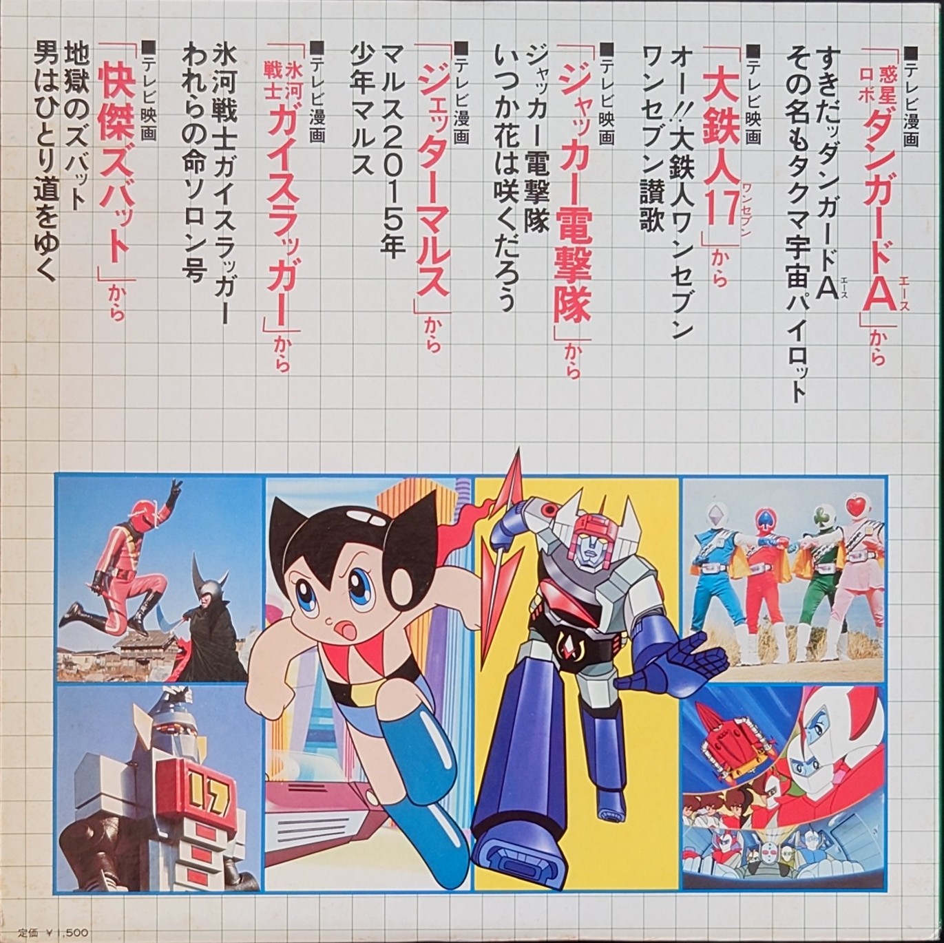 昭和動漫主題曲 < Golden Special電視動漫Action Deluxe > 1977 LP黑膠唱片 アニメ漫画 <テレビまんがアクション・デラックス > 1977 LPレコード 主打動漫主題歌/片尾歌包括: 太空保衛者, 大鐵人17號, 皇牌突擊隊, 鐵臂馬魯斯, 冰河戰士, 快傑Z等12首名主題曲/片尾曲. 日本生產 / Made in Japan LP 唱片狀況良好沒有明顯花痕附側紙. 唱片封套歌詞以個別彩頁方式印製, 屬罕有珍藏品. 封套及內頁由於年代久遠難免出現少許歲月痕跡, 決定購買前請小心考慮, 不設退換. 一般交收在石硤尾站, 可按買家需要另行安排順豐送貨. 曲目/SONG LIST A1 すきだッダンガードA A2 その名もタクマ宇宙パイロット A3 オー!! 大鉄人ワンセブン A4 ワンセブン讃歌 A5 ジャッカー電撃隊 A6 いつか花は咲くだろう B1 マルス2015年 B2 少年マルス B3 氷河戦士ガイスラッガー B4 われらの命ソロン号 B5 地獄のズバット B6 男はひとり道をゆく