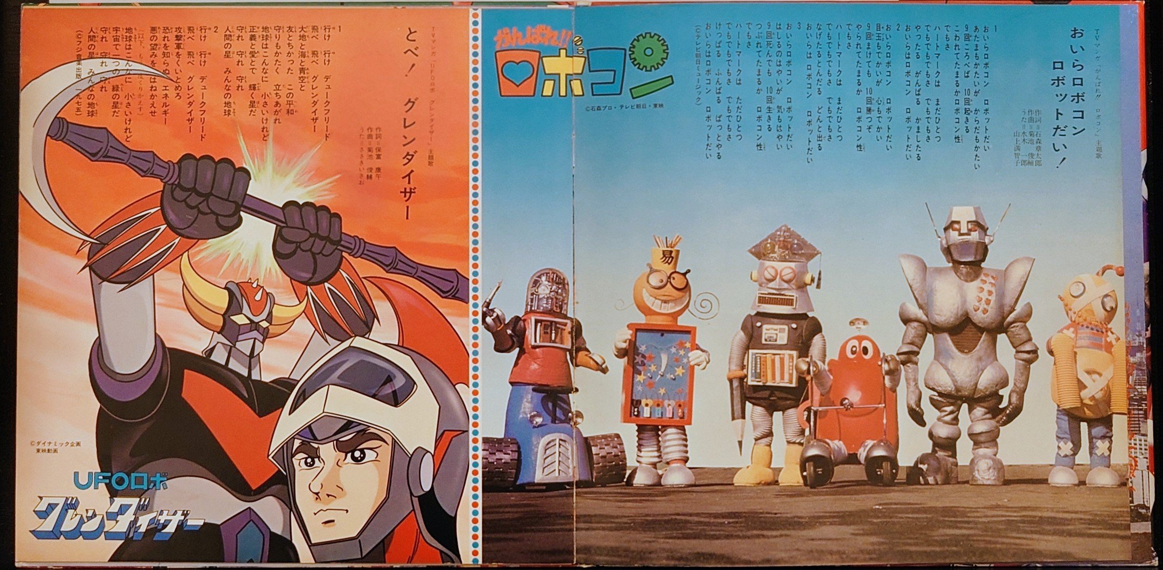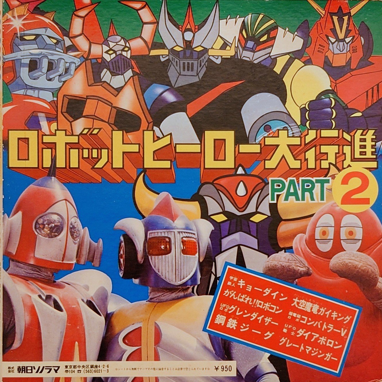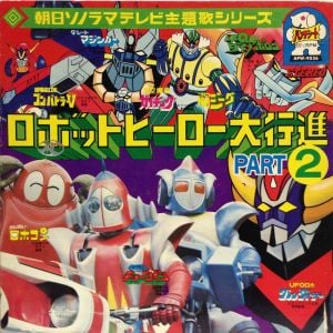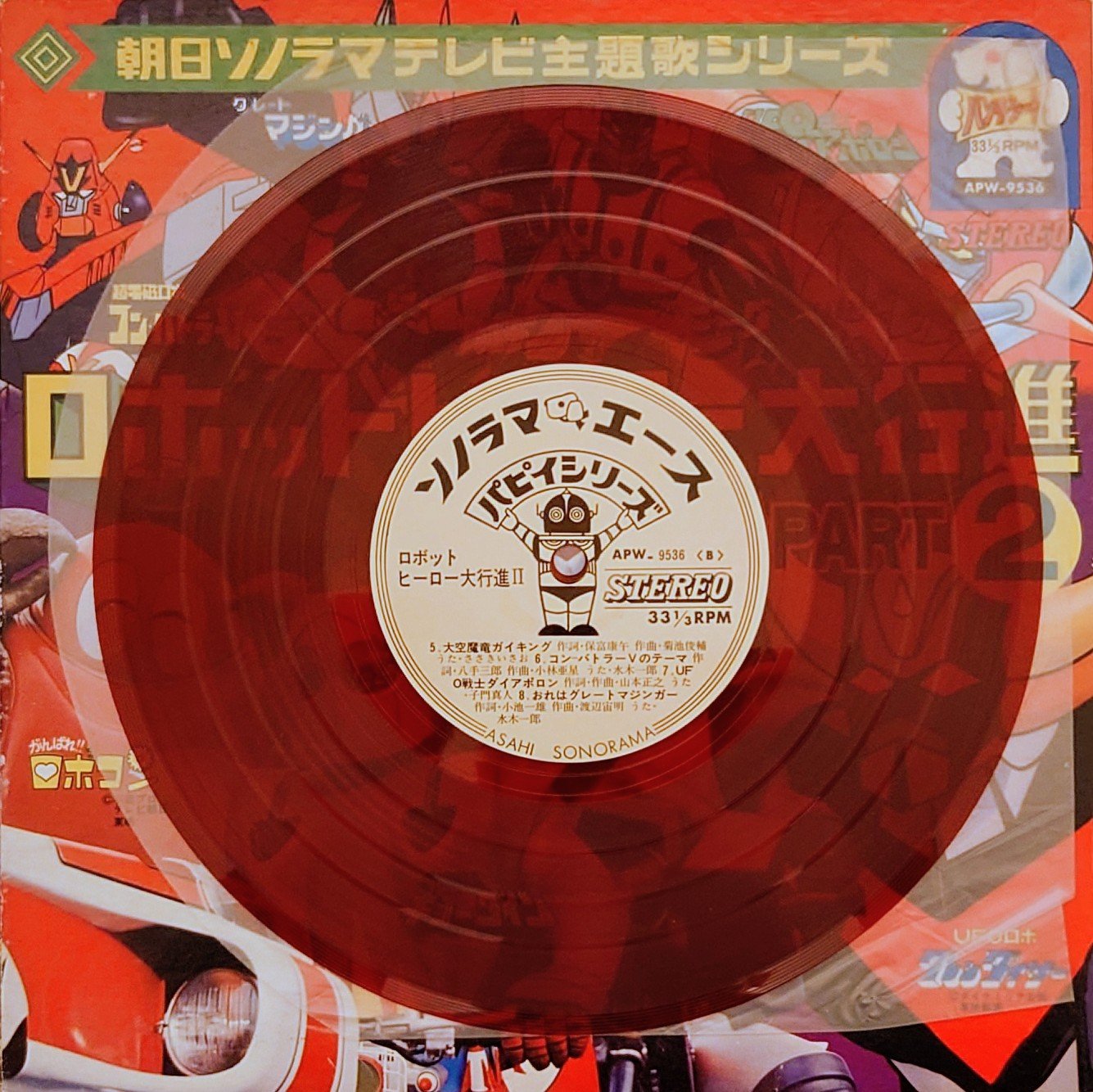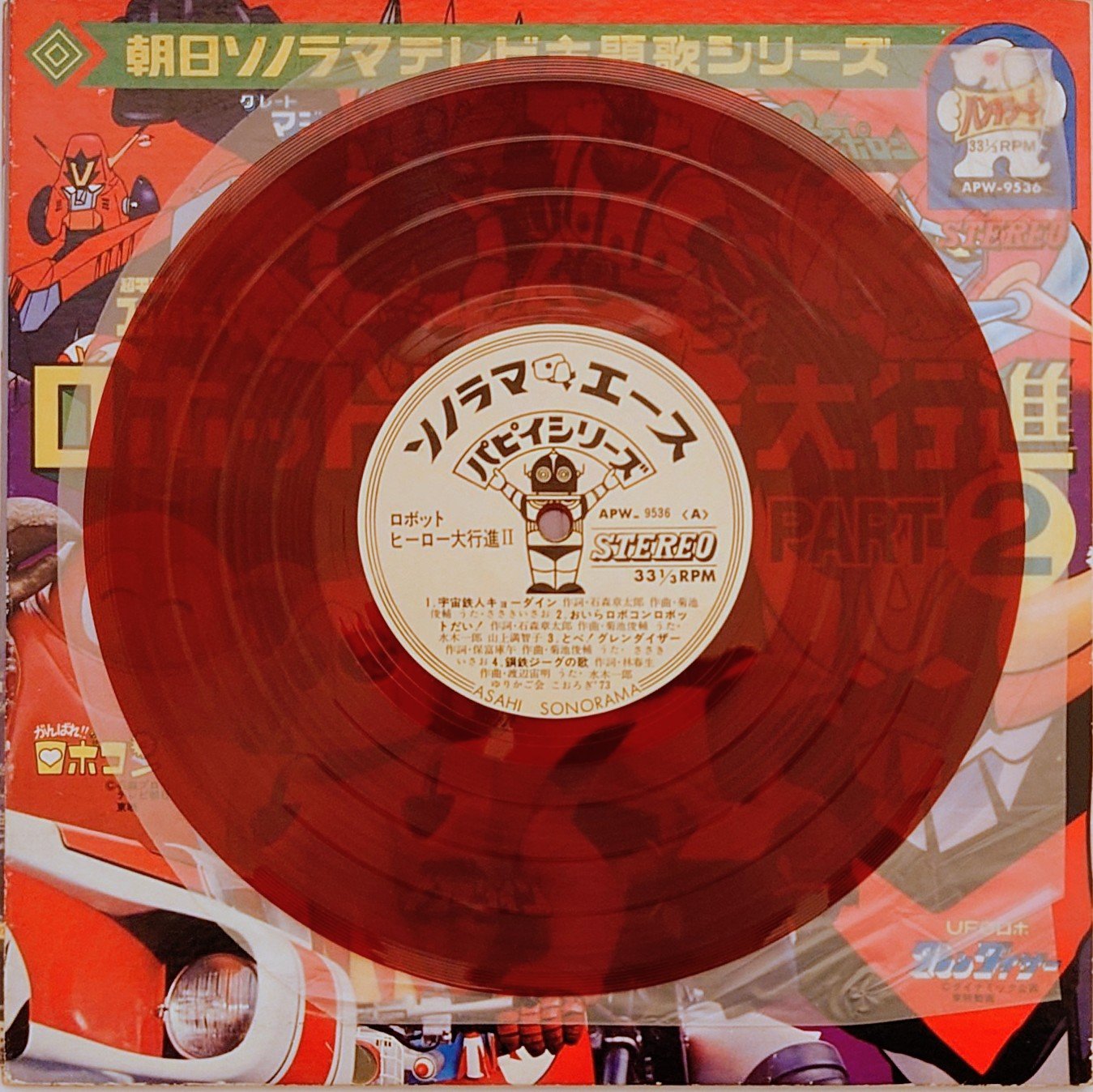 朝日Sororama電視主題歌集 < 機械人英雄大行進2 > 1976 8寸紅色軟盤 朝日ソノラマテレビ主題歌シリーズ < ロボットヒーロー大行進PART2 > 1976 赤盤ソノシートレコード 主打動漫主題歌包括: 天地雙龍, 小露寶, 巨靈神, 金鋼飛天鑽, 宇宙癹龍, 超力電磁俠, 太寶郎, 鐵甲萬能俠2號等8首名曲. 日本生產 / Made in Japan 8寸紅色軟盤為照和時代常用作卡通唱片的特別尺寸, 每面通常包含4首歌曲, 本來沒有側紙. 唱片狀況良好沒有明顯花痕, 因出品年代久遠, 封套/內頁有若破損及干使用痕跡, 決定購買前請小心考慮, 不設退換. 一般在石硤站交收, 另可按買家要求安排順豐送貨. 収録曲/TRACK LIST A1 宇宙鉄人キョーダイン A2 がんばれ!!ロボコン A3 UFOロボ グレンダイザー A4 鋼鉄ジーグ B1 大空馬竜ガイキング B2 超電磁ロボ コンバトラーV B3 UFO戦士 ダイアポロン B4 グレートマジンガー