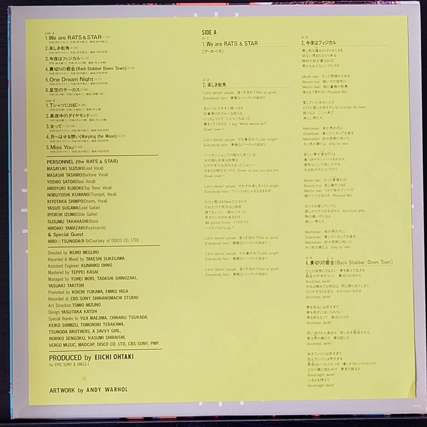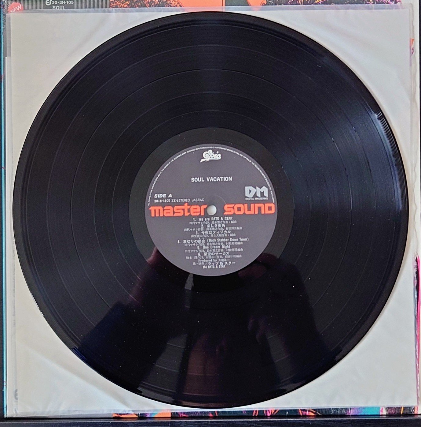 Rats & Star < Soul Vacation - MASTER SOUND > 1983 LP 黑膠專輯 ラッツ&スター < ソウル・バケイション - マスターサウンド> 1983 LP レコード 日本製 / Made in Japan LP 唱片狀況良好沒有花痕附側紙. 封套及內頁由於年代久遠難免出現少許歲月痕跡, 決定購買前請小心考慮, 不設退換. 一般在石硤尾站交收. 另可按買家需要安排順豐到付送貨. 曲目/SONG LIST A1 We Are Rats & Star A2 楽しき街角 A3 今夜はフィジカル A4 裏切りの都会 = Back Stabber Down Town A5 One Dream Night A6 星空のサーカス B1 Tシャーツに口紅 B2 真夜中のダイヤモンド B3 女って... B4 月へはせる想い = Warping The Moon B5 Miss You