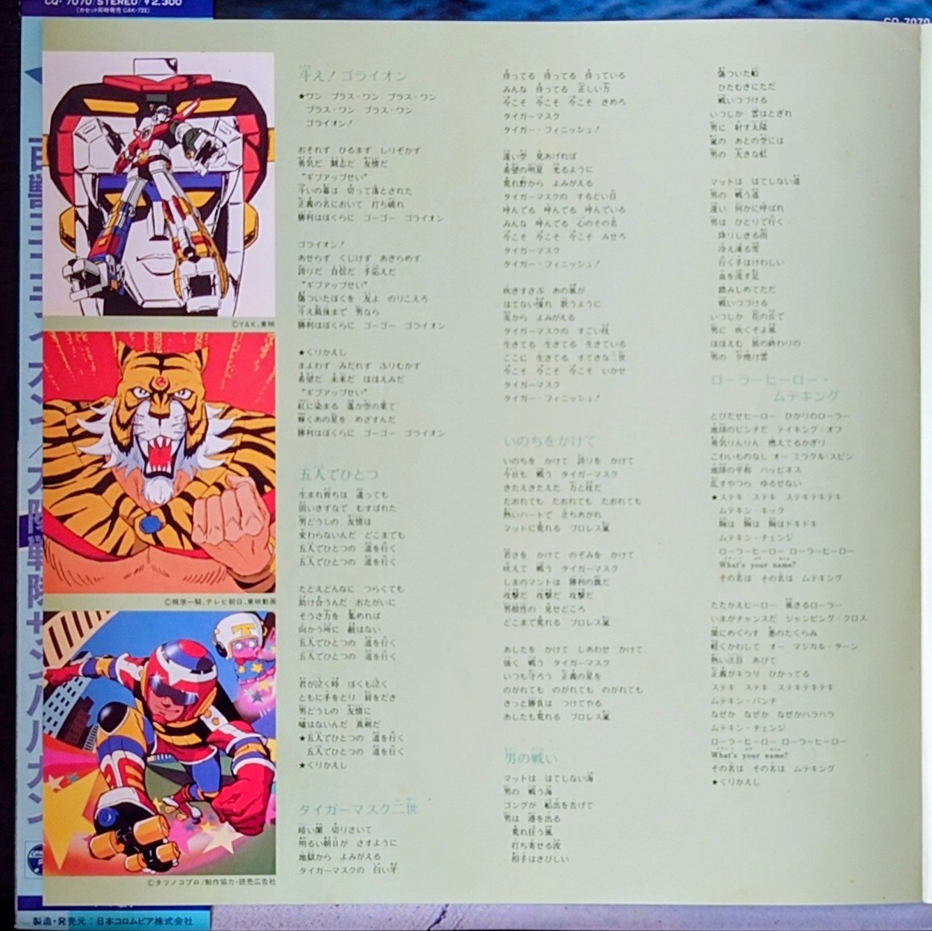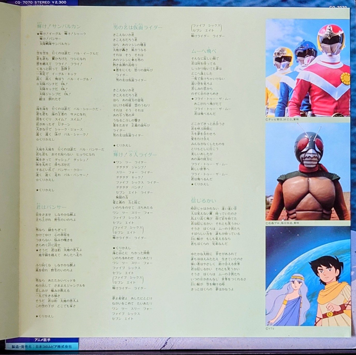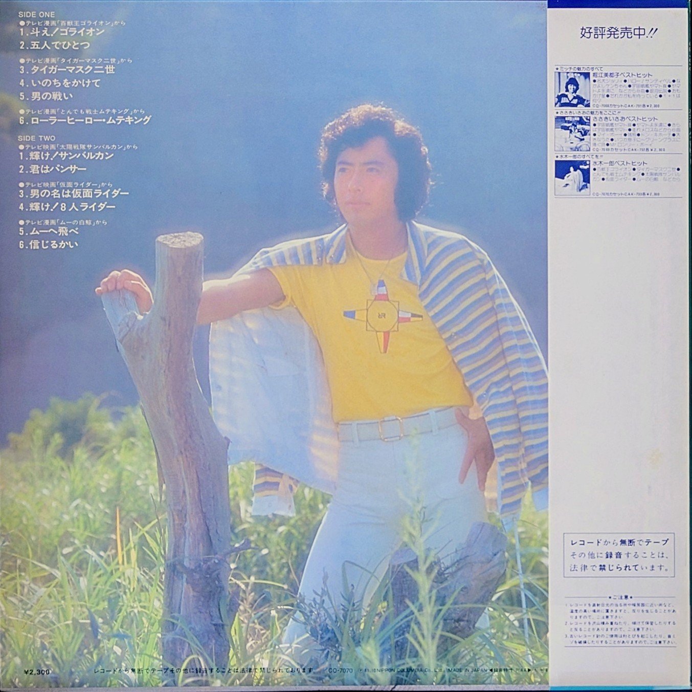 水木一郎 < Best Hit > 1981 LP黑膠專輯 水木一郎 < ベストヒット > 1981 LPレコード 主打動漫主題歌包括: 百獸王, 虎面人二世, 萬能戰士無比敵, 太陽戰隊, 電影版幪面超人, 巨鯨無比敵12首火熱動畫歌曲. 日本製 / Made in Japan LP 唱片狀況良好連側紙及彩頁歌紙, 封套有若干歲月痕跡, 決定購買前請小心考慮, 不設退換. 一般在石硤尾站交收, 另可按買家要求安排順豐送貨. 曲目/SONG LIST A1 斗え!ゴライオン A2 五人でひとつ A3 タイガーマスク二世 A4 いのちをかけて A5 男の戦い A6 ローラーヒーロー・ムテキング B1 輝け!サンバルカン B2 君はパンサー B3 男の名は仮面ライダー B4 輝け!8人ライダー B5 ムーへ飛べ B6 信じるかい