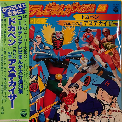 昭和動漫主題曲 <黃金電視動漫大行進24> LP黑膠碟專輯 昭和アニメ漫画<ゴールデンテレビまんが大行進24> LPレコード 主打動漫主題歌包括: Dokaben, 超神三戰士, 陰陽電磁俠, 宇宙飛龍, 摔角之星阿茲特克皇帝, 恐龍探險隊, 忍者七俠等14首名曲. 日本生產 / Made in Japan LP 唱片狀態良好沒有花痕連側紙及歌詞紙, 唱片封套罕有以彩色拉頁方式印製, 屬罕有珍藏品. 封套及內頁由於年代久遠難免出現歲月痕跡, 決定購買前請小心考慮, 不設退換. 一般交收在石硤尾站, 可按買家需要另行安排順豐送貨. 曲目/SONG LIST ドカベン A1 がんばれドカベン A2 ああ青春よいつまでも 超神ビビューン A3 斗え!!超神ビビューン A4 われらの超神ビビューン マグネロボ ガ・キーン A5 たたかえ!ガ・キーン A6 猛と舞のうた 大空魔竜ガイキング B1 星空のガイキング B2 大空魔竜ガイキング プロレスの星アステカイザー B3 カモン!アステカイザー B4 ファイト!アステカイザー 恐竜探検隊ボーンフリー B5 行け!ボーンフリー B6 恐竜よいつまでも 忍者キャプター B7 斗え忍者キャプター B8 大空のキャプター