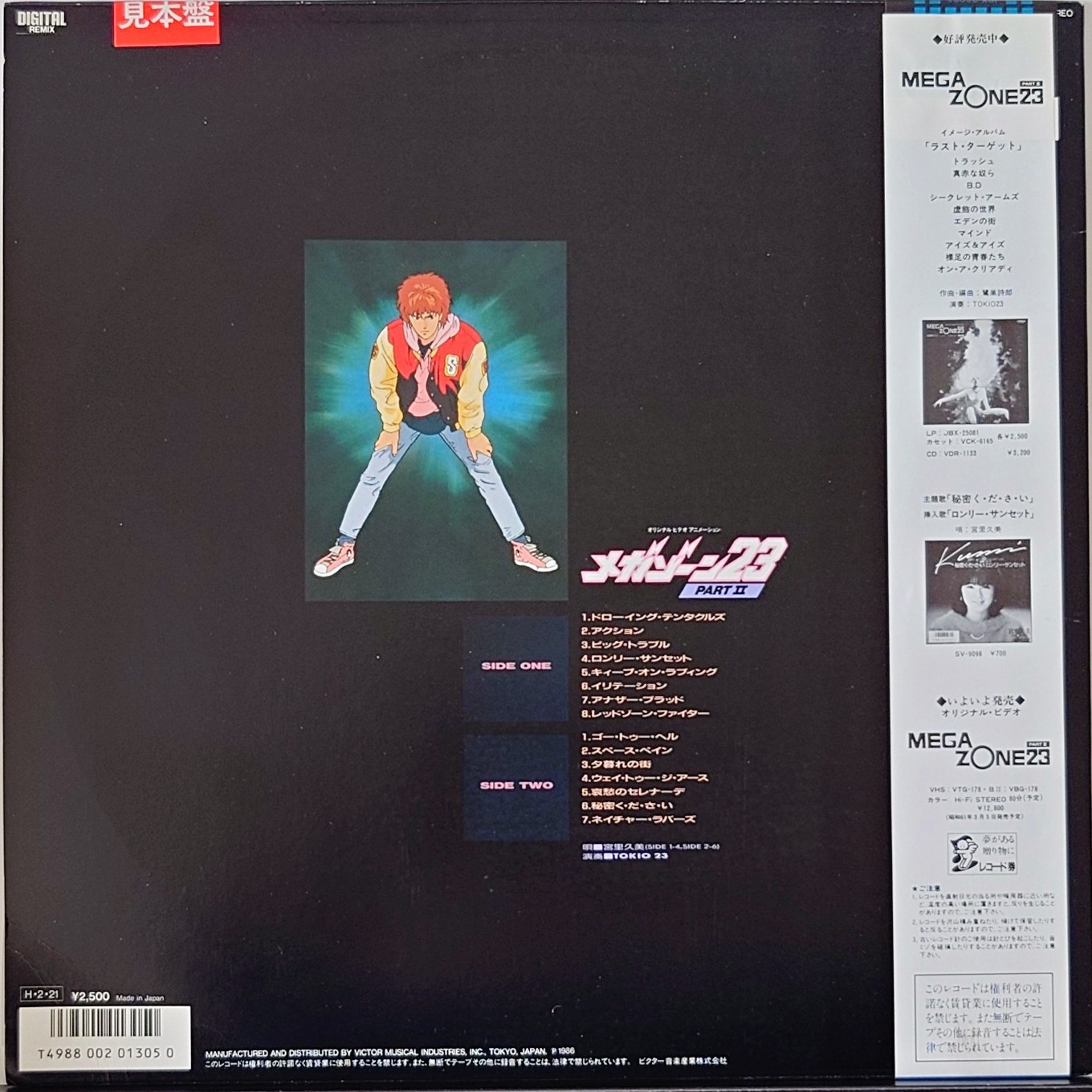 無限地帶23 < PART II 音樂編 > 1986 LP黑膠唱片 メガゾーン23 < PART II 音楽編 > 1986 LPレコード 日本生產 / Made in Japan LP 唱片狀況良好沒有花痕連側紙, 封面由美樹本晴彥老師繪製, 而且屬罕見本盤, 別具珍藏意義. . 封套及內頁由於年代久遠難免出現少許歲月痕跡, 決定購買前請小心考慮, 不設退換. 一般可在石硤尾站交收, 另可按買家需要安排順豐到付送貨. 曲目/SONG LIST A1 ドローイング・テンタクルズ A2 アクション A3 ビッグ・トラブル A4 ロンリー・サンセット A5 イリテーション A6 アナザー・ブラッド A7 レッドゾーン・ファイター B1 ゴー・トゥー・ヘル B2 スペース・ペイン B3 夕暮れの街 B4 ウェイ・トゥー・ジ・アース B5 哀愁のセレナーデ B6 秘密く・だ・さ・い B7 ネイチャー・ラバーズ