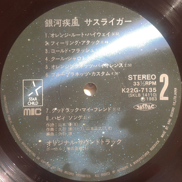 經典動畫 < 銀河疾風Sasuraiger > 1983 久石讓 LP黑膠專輯 アニメ映画 < 銀河疾風サスライガー > 1983 九石譲 LPレコード 日本製/Made In Japan LP 唱片狀況良好沒有花痕連側紙, 封面由姫野美智/荒木伸吾老師繪製, 並保留紀念POSTER, 別具珍藏意義. 封套及內頁由於年代久遠難免出現少許歲月痕跡, 決定購買前請小心考慮, 不設退換. 一般可在石硤尾站交收, 另可按買家需要安排順豐到付送貨. 曲目/SONG LIST A1 銀河疾風 サスライガー 2:35 A2 ホンキートンク・アステロイド 2:29 A3 ギャラクシー・ポップ 4:01 A4 レッツ・スペンド・ザ・J9・トゥギャザー 3:40 A5 グリーンプラネッツ・メランコリー 3:33 A6 ハッピー・ウインド 3:55 A7 イエロープラネッツ・フライヤー 2:32 A8 ハート・アタック 0:46 B1 オレンジ・ルート・ハイウェイ 3:32 B2 フィーリング・アタック 0:48 B3 コールド・フラッシュ 3:00 B4 クール・シャウト 3:18 B5 オレンジプラネッツ・バイオレンス 2:50 B6 ブループラネッツ・カスタム 4:06 B7 グッドラック・マイ・フレンド 3:12 B8 ハピィ ソング 2:11